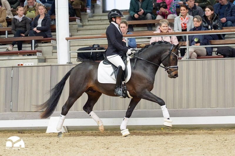 Dancing in the Midnight AT, ein Sohn des hannoverschen Siegerhengstes 2021 Dancing in the Moonlight AT, präsentiert sich als ein wahrer Traum in dunkler Jacke. Mit enormem Schwung im Trab, einem sehr gut bergauf gesprungenen Galopp sowie einem hervorragenden, raumgreifenden Schritt überzeugt er auf ganzer Linie. Doch nicht nur seine Grundgangarten und sein Interieur sind von außergewöhnlicher Qualität – auch am Sprung überzeugt er mit exzellentem Vermögen und viel Übersicht. Sein Vater Dancing in the Moonlight AT, Vollbruder zum Doppel-Westfalen-Champion Downtown Abbey von D-Power AT, kann bereits über 90 Platzierungen von Reitpferdeprüfungen bis hin zu Dressurprüfungen der Klasse M** vorweisen und unterstreicht damit eindrucksvoll seine sportliche Leistungsstärke. Die Mutter St.Pr.St. Dream Deluxe AT ist die jüngere Vollschwester des Vize-Westfalen-Champions und Bundeschampions der dreijährigen Reitponyhengste 2020 Date de Luxe AT. Aus der Großmutter Ratina XS, einer Tochter des Springsiegerhengstes Westfalen 2010 Rex The Robber und Vollschwester des bis M*-Springen erfolgreichen, gekörten Hengstes Rock’n’Roll, stammen zahlreiche weitere erfolgreiche Reitponys, unter anderem auch die Westfälische Siegerstute 2025, Damastina AT. Muttervater ist kein Geringerer als unser Stempelhengst Dating AT NRW. DANCING IN THE MIDNIGHT AT – vereint bestes Dressur- und Springblut.