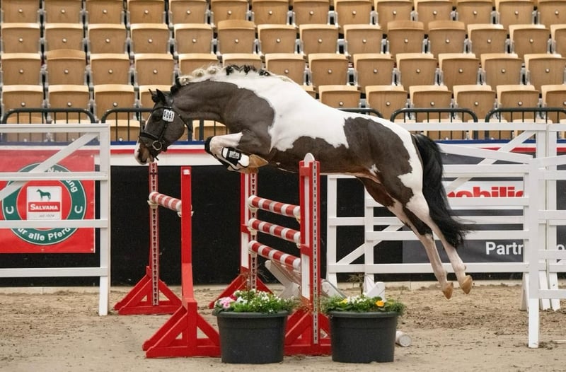 Romano ist ein höchst nobler und charismatischer Sohn des Petit Rock the Moment, der sich anschickt das züchterische Erbe seines Vaters fortzuführen. Anlässlich seiner Körung im Februar 2025 galt er bereits als Publikumsliebling und konnte den Körplatz in den Holstenhallen zu Neumünster, neben dem Prädikat gekört, als Prämienhengstanwärter verlassen. Seine Mechanik, Manier und Vermögen am Sprung und sein ausgegli9chener Charakter überzeugten nicht nur die Körkommission sondern auch das Publikum. Seine auffällige Scheckzeichnung verleiht seinem harmonischen, gut aufgeteiletem Exterieur das gewisse Extra und sorgt dafür, dass dieser Hengst im Gedächtnis bleibt. Besonders vor dem Hintergrund, dass Petit Rock the Moment derweil als Wallch nicht mehr züchterisch eingesetzt werden kann, freuen wir uns unseren Züchtern diesen Eyecatcher im Natursprung zur Verfügung zu stellen. Derzeit befindet sich Romano in der Vorbereitung auf seine ersten Turnierstarts und steht Fremdstuten bei uns zur Verfügung