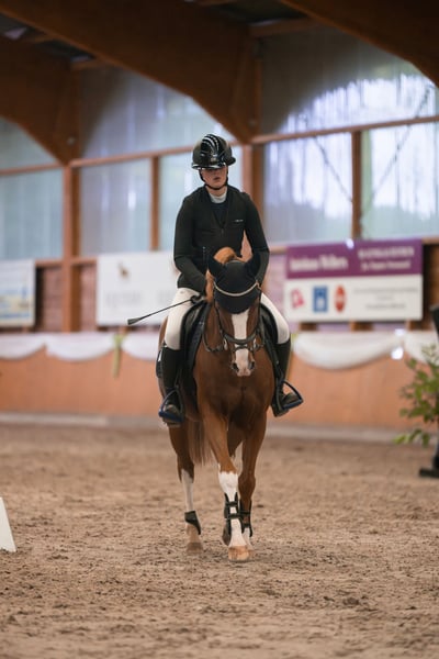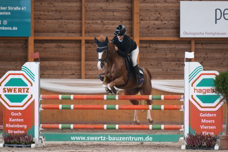 Due to the end of his pony career, a 2016-born German Riding Pony gelding, sired by Mason out of a Mentos mare, is available for sale. He has a height of 144 cm and covers very well (rider height 1.72 m). He has numerous placings from local competitions up to A** level, including several wins, and has been introduced to L-level jumping. He is a very sensitive and cautious pony with a lot of talent, therefore he needs a confident, ambitious rider who can provide him with the necessary security. In the jumping course, he is well-equipped and does not like to make mistakes. He has three good basic gaits and can be ridden very delicately in dressage. He masters a secure outdoor canter and lateral movements in all three basic gaits. He also performs flying changes without any issues. In handling, he is very well-behaved and uncomplicated, friendly and manageable in every situation. From the ground, almost everything can be done with him; with good trust, he can be ridden without saddle or with a halter. He is shoe- and loading-safe. He is familiar with turnout in a group and always shows himself to be social and tolerant. Overnight competitions and trips to the seaside are no problem for him. When hacking out, he is fearless and well-behaved. An ideal pony for ambitious young riders seeking a high-performance, eager sport pony with talent. (Not suitable for beginners) A viewing fee of €25 applies for trial riding, which will be deducted from the purchase price. Interested parties can contact us at 0172 2497005.