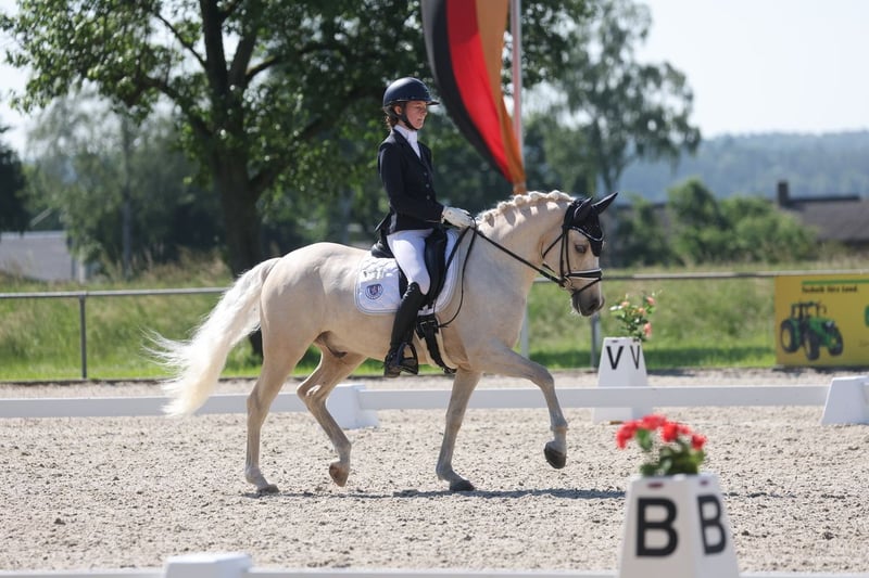 Glitzerflitzer is een betrouwbaar en rustig pony dat zijn ruiter altijd veiligheid biedt. Vooral in stap en galop overtuigt hij met veel kwaliteit, takt en een prettig zitgevoel. Hij heeft meerdere pony-FEI wedstrijden gelopen en is geplaatst, met een score tot 69,*%. In de nationale klasse heeft Glitzi verschillende L-dressuren gewonnen, onder andere met cijfers tot 8,5. Daarnaast is hij meerdere keren gestart op de Zuid-Duitse Pony Kampioenschappen en op de Hessische Kampioenschappen. Hij is zeer braaf in omgang, helder van geest en daardoor ook in nieuwe situaties kalm, of het nu op het concours, tijdens training of in het dagelijks leven is. Hij wil zijn ruiter altijd behagen en werkt gemotiveerd mee. Glitzi is ideaal voor een ambitieuze jonge ruiter die op zoek is naar een pony waarop je kunt vertrouwen en waarmee je samen kunt blijven groeien. FEI-meten. Video op aanvraag.
