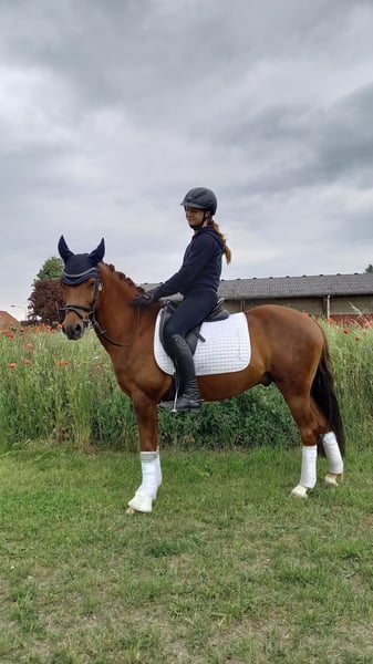 🐴 German Riding Pony – Nacro’s Artax ✨ Expressive. Talented. Reliable. With Nacro’s Artax, we offer a special German Riding Pony that impresses with his willingness to perform, versatility, and lovable character. Artax has been in our possession since he was 3 years old; he was trained by us with a lot of experience, patience, and dedication, and has always been in excellent health. 💫 Training & Achievements: Artax is a motivated partner who always aims to please his rider. He can win at A-level dressage and also shine effortlessly in lead-rein classes – a true all-rounder! He is familiar with jumping courses and cross-country obstacles up to A-level, making him very suitable for eventing. Artax reliably works on the simple and double longe, calmly goes out on rides in the terrain, crosses water and stubble fields, and enjoys extensive hacks. He also happily masters seat training on the longe with children, calmness exercises, and play sessions. 🩺 Health & Care: Artax is healthy, robust, and well cared for. A previous veterinary error (incomplete castration) was professionally and smoothly corrected at the clinic – since then, everything has been in perfect order. He lives outdoors full-time in a harmonious gelding herd and wears front shoes. 🧒 Character & Ideal Home: Artax is people-oriented, sensitive, and talented – therefore not suitable for beginner riders. He is looking for a compassionate owner or family who can provide him with calm, trust, and security. In return, he will open his heart and show how much potential and love he has to offer. Since our sons have given up riding, we are now seeking a nurturing home with heart and horse sense for Artax. 💰 Price: Price on request 💵 Trial ride: €80, credited towards purchase 💖 Summary: Artax is a talented, sensitive riding pony for ambitious children, teenagers, or small adults seeking a reliable, honest partner for dressage, trail riding, and leisure. Anyone who gets to know him will fall in love.