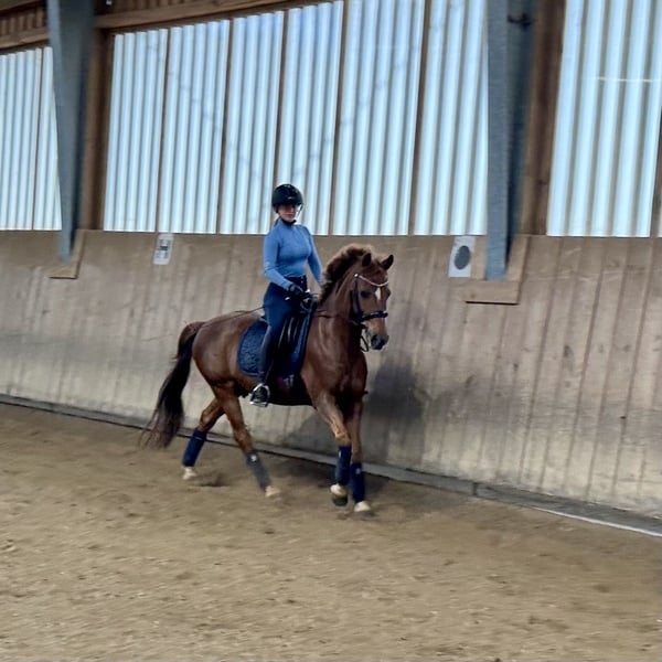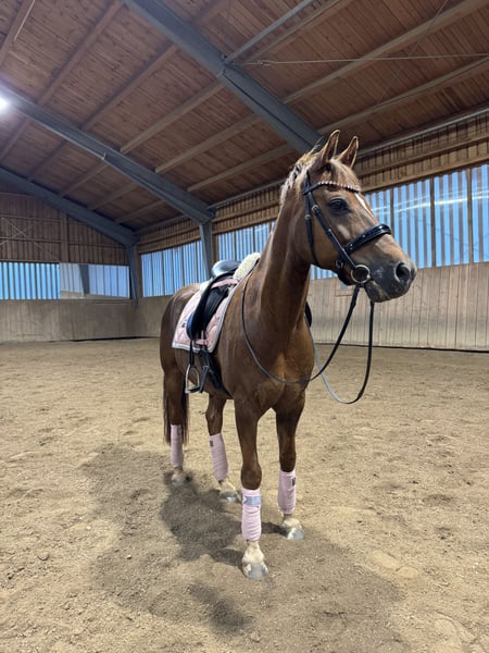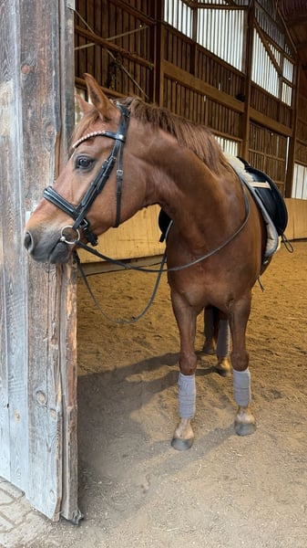 Nach vielen gemeinsamen Jahren suche ich schweren Herzens ein neues liebevolles Zuhause für meinen süßen „Donny“. Don Daimond de Luxe – Wallach, Fuchs, 14 Jahre alt, Stockmaß 1,48 m, deutsches Reitpony Donny ist im Umgang ein wahrer Schatz und orientiert sich stark an seinem Menschen. Vom Putzen über Spaziergänge und Bodenarbeit hat man immer Freude mit ihm. Auch beim Reiten ist Donny ein motivierter Partner, der gefallen will. Ein gewisses Maß an Sicherheit sollte man ihm vermitteln können. Aktuell wird Donny hauptsächlich Dressur geritten, aber auch Springstunden stehen ab und zu auf dem Programm. Wer Spaß am Springreiten hat, wird mit Donny sicher Freude haben. Er zeigt hier gute Qualitäten, möchte hierbei aber nicht allein gelassen werden. In Bezug auf andere Pferde ist er sehr umgänglich und immer freundlich. Aktuell steht Donny in einer Box mit Paddock und genießt ganzjährig den täglichen Weidegang. Offenstallhaltung kennt er aber auch. Hier fühlt er sich in einer ruhigen und ausgeglichenen Herde besonders wohl. Er befindet sich seit mehr als 7 Jahren in unserem Besitz und hatte nie gesundheitliche Probleme. Er war bei uns nie beschlagen und damit kommt er auch gut zurecht. Im Gelände nutze ich aufgrund vieler steiniger Wege aktuell Hufschuhe an der Vorderhand. Ich kann leider aus beruflichen&privaten Gründen nicht mehr so einfach die Zeit erübrigen, die ich gerne in die Haltung eines Pferdes investieren möchte. Daher suche ich ein neues Zuhause, wo Donny von einer oder wenigen festen Bezugspersonen so geliebt wird wie von mir. Gerne können wir telefonisch weitere Details besprechen und uns kennenlernen. Videos auf Anfrage.