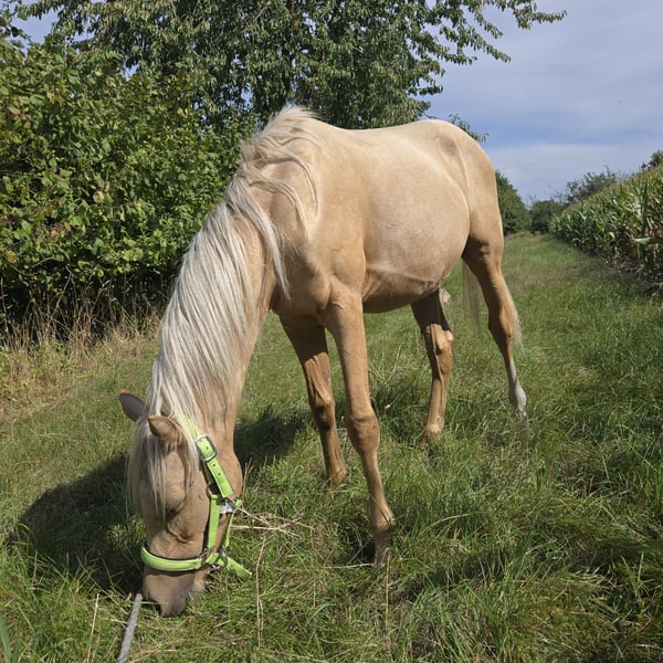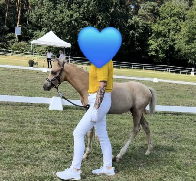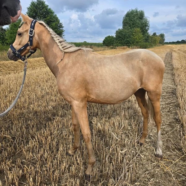 Zum Verkauf steht ein bildschöner Palomino-Wallach (geb. Mai 2024) mit Spitzenabstammung. Aufgrund leider privater Umstände, wird er in Beste Hände verkauft. Charakter: Unerschrocken, kinderlieb und absolut brav im Umgang - ein echtes Traumpony, das jeden Tag Freude macht. Bewegung & Potenzial: • Schöne, elastische Grundgangarten • Verspricht ein tolles Turnierpony mit Zukunft zu werden • Wird voraussichtlich Endmaß erreichen (Mutter 1,55 m) Abstammung (Auszug); • Vater: Cadlanvalley Sir lvanhoe (Cremello) • Mutter von FS Champion de Luxe und Golden Dancer geprägt Ein Nachwuchspony mit bester Genetik tollem Interieur und großem Zukunftspotenzial! Zeigte sich auf der Fohlenschau 24 schon stets bemüht und absolvierte den 1 Platz. Wurde im Mai 25 kastriert aufgrund gemischter Herde. Steht derzeit im Offenstall. Wir sehen ihn als zukünftiges Turnierpony , Kinderpony mit toller Zukunft. Bei Fragen oder Interesse gerne melden :)