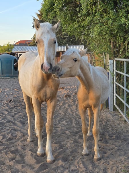 Deutsches Reitpony in der beliebten Farbe Palomino. "Checker Charly" ist ein ultrasüßes Kerlchen ... mit tollem Gebäude und bestem Interieur. Er kennt bereits den Umgang mit Kindern und ist allzeit freundlich, nett und nicht aufdringlich. Völlig unerschrocken und immer korrekt im Handling geht er sogar mit kleinen Kindern spazieren. Er liebt es zu kuscheln und freut sich über jede Aufmerksamkeit! Bei der Fohlenschau wurde er prämiert. Seine Mami ist eine zauberhafte Kinderreitponystute die eine absolute Lebensversicherung ist. Sein Papa ist der Cremello Hengst Söl'rings Cuvée. Ebenfalls mit bestem Interieur ausgestattet bringt dieser auch Sportlichkeit mit sich. Checker Charly zeigt bereits jetzt hervorragende Anlagen und Bewegungen, die ihn zu einem vielseitigen und vielversprechenden Kandidaten für allerlei Sparten der Reiterei macht. Er ist bereits gelegt, natürlich geimpft und mehrfach entwurmt, sowie regelmäßig dem Schmied vorgestellt. Endmaß schätzen wir auf 135-145cm Gemessen am 10.12.2025 (Alter 1 Jahr und 8 Monate) = 127cm Auf Wunsch kann er zur weiteren Aufzucht noch bei uns stehen bleiben.
