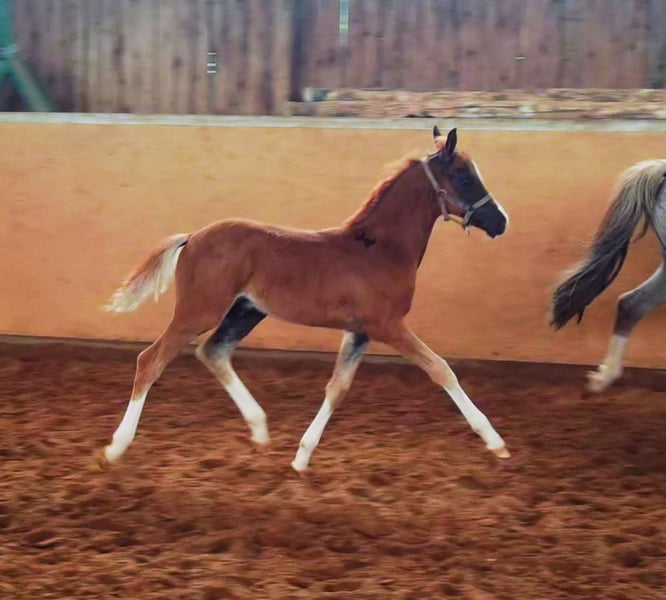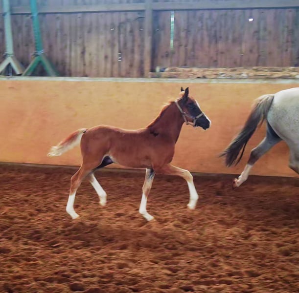 Dovers Abstammung ist Leistung pur. Seine Vatersseite enthält einen Bundeschampion nach dem anderen . Seine Mutter Nele hat die Staatsprämie , ihr Vollbruder Napoli ist zZt bis zur Klasse M in Amerika platziert, Die Großmutter Santa Fee war Siegerin bei der Eintragung, Siegerin im IG Stutenpreis und ist die Vollschwester zu den gekörten Sieger und Reservesieger Sheraton und Shalom, welche beide bis M Dressur platziert sind und sich mehrfach fürs BC qualifiziert haben. Eine weitere Vollschwester ist bis M Dressur und ein Vollbruder nahm an den Westfälischen Meisterschaften im Springen teil. Santa Fees Vater Santiago ist Prämien- Leistungshengst und Süddeutscher Körungssieger .Seine Vollbrüder Schiwago (auch Süddeutscher Körungssieger erfolgreich bis S Dressur) und Sydney HLP Sieger , Veronika Bundesprämienstute und Visa . Aus der Visa stammt Deluxe (3x BC qualifiziert und seit Jahren ein fester Bestandteil im österreichischen Pony Dressur Kader . Eine weitere Tochter Notre Dame ist siegreich in S Dressur in Amerika und ihre Vollschwester Normandie hat die Staatsprämie und führt die Linie der Visa in der Zucht weiter, Visas und Santiagos Vater Schwalmprinz war Körungssieger und Bundesreservesieger . Seine Eltern waren die legendäre Starlyte Pawlova war beste Europäische Welshstute in Ermelo und sein Vater Sarnau Showman war 3x Sieger der Royal Welshshow und führte jahrelang die Rangliste der englischen,hollandischen und belgischen Sportponys an . Dover hat auf der Fohlenschau die Goldprämie erhalten. Die gemachte Angaben sind unverbindliche Beschreibungen und stellen keine zugesicherten Eigenschaften dar. Der Verkäufer haftet nicht für Irrtümer, Eingabefehler und Datenübermittlungsfehler.