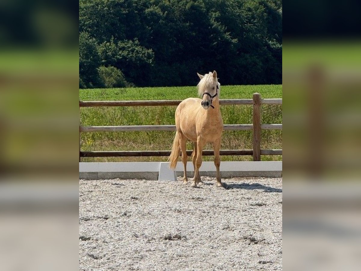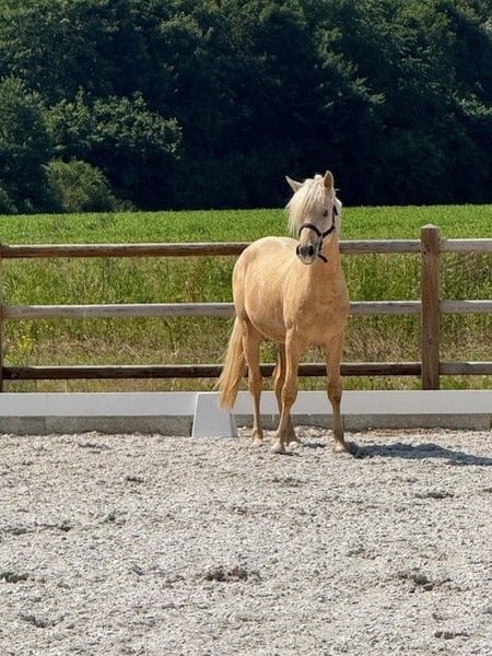 **Sales Advertisement: German Riding Pony Stallion Candidate** For sale is a beautiful German Riding Pony stallion, born in 2023. With his striking palomino coat and a height of 145 cm, he is not only a real eye-catcher but also a promising talent for dressage and show jumping. This young stallion impresses with his movement quality and his friendly, open demeanor. He is very well-mannered and will be prepared for the licensing starting at the end of August. Therefore, there are two prices: before the licensing and after the licensing. The last two stallion foals from the mother have been licensed. He will definitely be a very good sport pony. His pedigree speaks for itself, and if you have any questions, feel free to call me. His potential in dressage is promising, and he will surely bring a lot of joy and success in sports. If you are interested or have further questions, we look forward to your message!