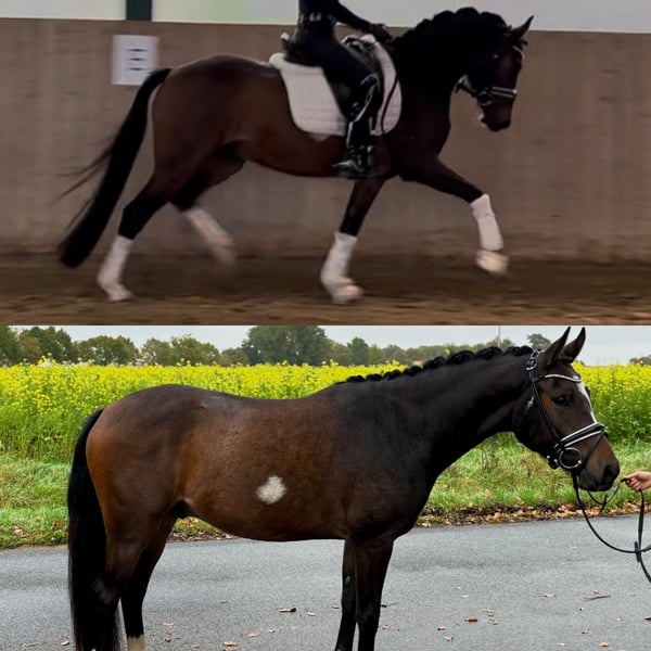 À vendre, un hongre bai de 3 ans, élevé par ses soins, issu de Gipfelstürmer du Gründleinshofs x Nobelstar, avec une taille au garrot de 1,48 m. C’est un cheval compact, bien construit, qui séduit par sa belle apparence et ses trois allures de base très bonnes. Pour son âge, il se montre déjà très équilibré, avec un rythme de base agréable et adapté. En daily handling, il est totalement facile, amical et toujours attentif à bien faire. Il a déjà été monté par des enfants et répond parfaitement aux aides – un jeune hongre qui procure simplement du plaisir et inspire la confiance. Montez, partez en balade et sentez-vous bien. Il a déjà participé à ses premières compétitions et y a prouvé sa qualité et sa sérénité. De bonnes radiographies sont disponibles.