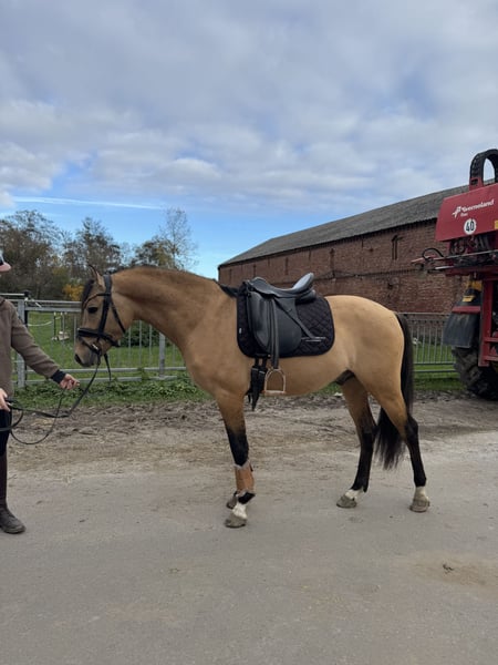 Dieses wunderschöne Pony in edler Falbjacke (aktuell 1,45 m, noch im Wachstum!) sucht nun seinen passenden Möhrchengeber. Ein echter Schatz – sozial, brav und unglaublich menschenbezogen. Schon als Fohlen wusste er zu überzeugen: Sieger des Fohlenchampionats, ausgestattet mit drei guten Grundgangarten und einem harmonischen, elastischen Bewegungsablauf. Er wurde von einer 14-jährigen Reiterin mit angeritten und zeigt sich dabei stets motiviert, aufmerksam und immer bemüht, alles richtig zu machen. Auch auswärts im Training war er bereits und hat sich dort von seiner besten Seite gezeigt – brav, unkompliziert und neugierig bei allem Neuen. Selbstverständlich ist er schmied- und verladefromm und zeigt sich auch im täglichen Umgang absolut unkompliziert. Mit weiterer Förderung wird er sicher ein tolles Kinder- oder Jugendpony – und später vielleicht auch ein spannendes Nachwuchspony für die FEI-Tour. Seine gute Sprungmanier lässt zudem vermuten, dass er sich auch hervorragend als Hunter- oder vielseitiges Reitpony entwickeln könnte. Er liebt die Bodenarbeit, probiert begeistert Neues aus und sucht immer die Nähe zum Menschen. Anfangs etwas vorsichtig, taut er sehr schnell auf und schenkt seinem Menschen dann sein ganzes Vertrauen.