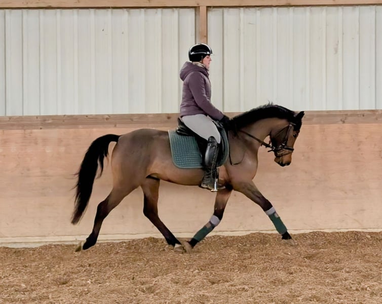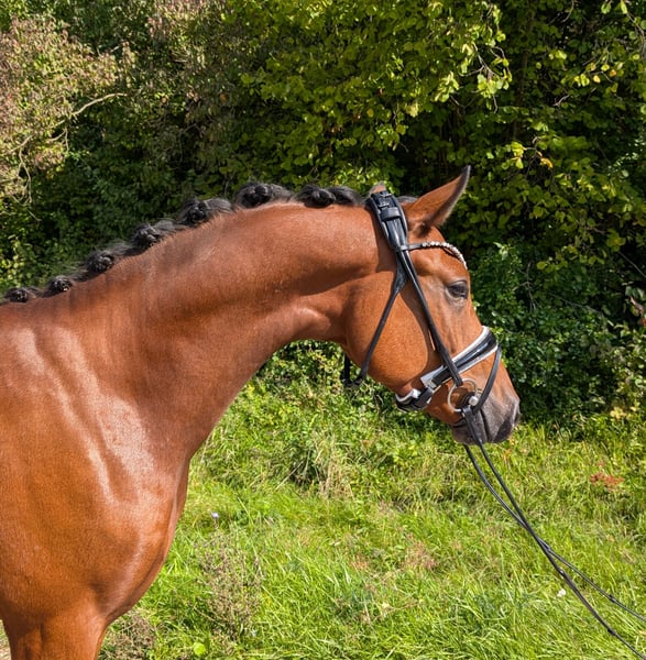 Our Napoleon is a very handsome pony and has an ideal pony-sized build. He is lightly backed but still occasionally unsure, so he needs an experienced handler to continue his development. A pony with a lot of quality that still has much to learn. He also shows great talent in free jumping. His dam, Demi Moore, is placed in E and A dressage with my young daughter. His sire, New Prince M, has competed successfully up to FEI level and has achieved wins up to class L. His full sister has already competed successfully in riding horse tests against larger horses. For inquiries, please call 0170-3047575.