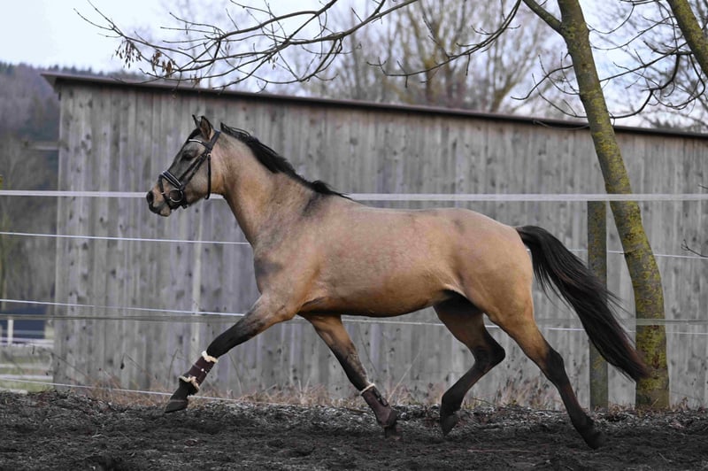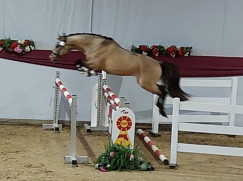 Der kleine Prinz vom Filstal ist ein Pony aus 2021 mit derzeit einem Stockmaß von 1.44m. Er ist nicht nur optisch ein echter Herzensbrecher er lässt auch unter dem Sattel keine Wünsche offen. Seine Mutter Frl. Felicitas war in den Jahren in denen sie im Sport ging das erfolgreichste Baden Württemberger Pony in der Vielseitigkeit. Sie hat mehrmals die Prüfungen in der Vielseitigkeit A * und ** Sterne gegen Großpferde gewonnen und war auch in L-Springen siegreich gegen Großpferde. Sie hat die richtigen Einstellung am Sprung und hat das an ihren Sohn weiter vererbt. Frl. Felicitas ist als Sportregisterstute aufgenommen ins Zuchtbuch in Baden Württemberg. Prinz wurde gekört und süddeutsch anerkannt. Mittlerweile geht er stressfreier als Wallach durch die Welt. Er wurde solide angeritten ist brav und willig und sehr rittig, wurde aber erst spät gesprungen (Dezember 2025).Die Bilder sind aus den ersten 3 Springeinheiten seiner Ausbildung unter dem Sattel. Sofort war zu bemerken, dass er hierfür genügend Herz hat und die richtige Einstellung hat. In der Dressur ist er willig, beginnt Last aufzunehmen und sich zu präsentieren. Alle drei Grundgangarten, wie bei einem gekörten Hengst üblich, sind überdurchschnittlich. Das Freispringen ist aus seiner Körung und der süddeutschen Anerkennung. Im Film im dem er steht wird sehr schön beschrieben wie er einzuschätzen ist. (Ton anmachen) Sein Vater ist Kastanienhofs Donnertrommler. Kastanienhof Donnertrommler ist ein dressursportlicher Musterschüler und Jahr für Jahr ein Erfolgsgarant. Er war siegreich in Reitpferde- und Dressurpferdeprf. Kl. A und mehrfach platziert in Dressurpferdeprf. Kl. L. 2017 und 2018 platzierte er sich im Bundeschampionatsfinale in Warendorf. Ende 2017 absolvierte er seinen HLP-Kurztest in Münster-Handorf als Sieger wobei er in allen Grungangarten gleichmäßig hoch benotet wurde und in der Rittigkeit mit 9,08 erwartungsgemäß punktete. Auf der FN-Bundeshengstschau 2019 in Berlin war Donnertrommler Endringhengst der jüngeren Hengste und wurde mit der FN-Bundesprämie ausgezeichnet. Mittlerweile ist Donnertrommler im FEI-Sport erfolgreich und in 2021 auch bereits international in Kronberg platziert. Diese Leistung ist kein Zufall: in direkter Folge reihen sich in seinem Pedigree die internationalen FEI-Sieger Dornik B, Kennedy WE und FS Don’t Worry aneinander. Alle drei feierten ebenfalls Erfolge in Dressur Klasse S und waren bis ins hohe Alter sportlich aktiv und erfolgreich. St.Pr./El.St. Diva Delight ist Vollschwester des WE-Siegerhengstes Kastanienhof Kentaur WE und Halbschwester des WE-Siegerhengstes Kastanienhof Cockney Cracker WE. Die Ur-Großmutter Nontesse brachte neben Delight die beiden gekörten Hengste Danny’s Dream (S-Dr.) und Delgado (M-Dr., 7. Pl. EM 2001) sowie zahlreiche Sportponys in allen Sparten. Der kleine Prinz vom Filstal wartet auf SEIN Kind mit dem er viele viele Jahre erfolgreich im Sport seinen Weg gehen kann. Kein Notverkauf und kein zur Verfügung stellen. Der Preis ist im Moment noch verhandelbar. Wenn er weiter in Beritt geht und dann auf Turnier vorgestellt wird, kann er nicht auf dem Stand bleiben. Standort Baden Württemberg.