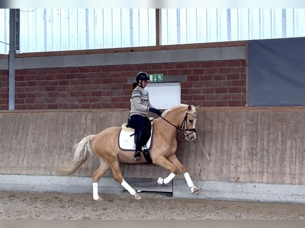 Dieser bildschöne Palominowallach überzeugt nicht nur mit drei sehr guten GGA, sondern auch mit einem tollen Interieur. Auf Grund seiner hohen Rittigkeit und seiner idealen Größe sicherlich ein tolles Nachwuchspony für den FEI Sport oder auch für das Bundeschampionat 2026. Er macht bereits spielerisch Außengalopp und Seitengänge. Ein absoluter Schatz im täglichen Handling. Putzen, Waschen, Schmied. Alles völlig problemlos. Ein guter Züchtertüv liegt bereits vor.