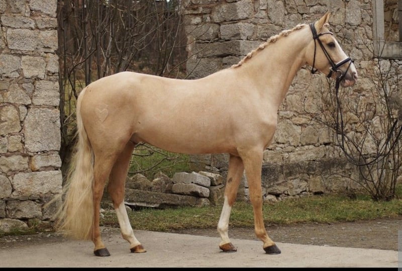 For sale is a very willing and talented Palomino gelding. Goldie impresses every day with his eagerness to work. He is currently in professional training and can be viewed at any time. He is 5 years old, A-certificate qualified, and already mastering basic L-level dressage movements. He is well-behaved in the terrain and enjoys variety. He also handles small jumps, although he has not been further trained in jumping. He is very affectionate with people, loves cuddling, and enjoys the company of his handler. He is friendly and social in his interactions and gets along very well with other horses. In addition to riding, groundwork and handwork have been carried out with him. He is currently barefoot but is also familiar with shoes. He can be ridden by children or teenagers, but should continue to be regularly ridden by an adult due to his age. He shows curiosity towards different surfaces, tarps, a large ball, or even when he slips from behind – all of which do not disturb his calm. He also loves water and happily walks through puddles. Farrier work, loading, and veterinary visits are no problem at all. He measures 1.47 meters at withers.