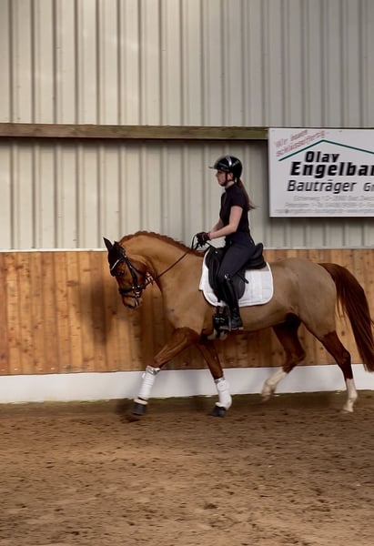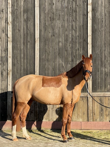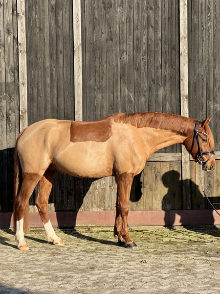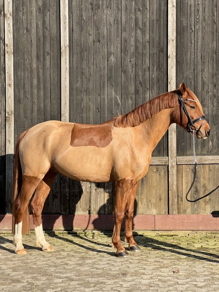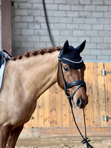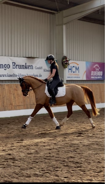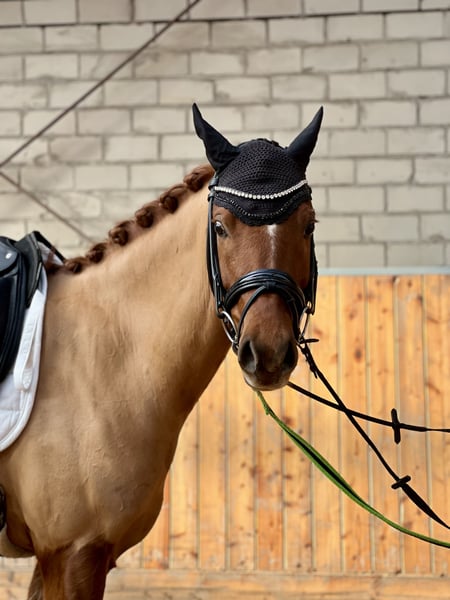 Te koop staat een veelbelovende Duitse rijponyhengst genaamd Dancing Fire, afstammend van Dance Star At, geboren in 2021. Deze charmante voskleurige ruin valt op door zijn elegante uitstraling en aangenaam temperament. Met een stokmaat van 152 cm is hij perfect voor de ambitieuze recreatie-rijder of de opkomende wedstrijdruiter. De ruin toont al goede basisvaardigheden in de dressuur en overtuigt door zijn open en leergierige aard. Hij is goed bereden, attent en beschikt over een degelijke basisopleiding. In de dagelijkse omgang is hij zeer lief, maar heeft hij een positief "Go" onder het zadel. Daarom is hij niet geschikt voor de absolute beginner. De moeder was zelf succesvol in alle disciplines (springen tot L), daarom denk ik dat je met hem alles kunt doen. In het vrijspringen toont hij ook motivatie en maakt hij een goede sprong. Deze talentvolle rijpony is een echt allround talent dat met zijn charmante karakter en potentieel enthousiasmeert. Het is een ideale aanvulling voor iedere pony-liefhebber die waarde hecht aan kwaliteit, karakter en toekomstpotentieel. Hij staat momenteel onder het zadel en zijn prijs zal stijgen na verdere opleiding. Hij staat bij ons in een gemengde kudde, 's nachts in de box en overdag op de paddock. Bij interesse horen we graag van u via bericht of telefonisch: 0176-45979929.