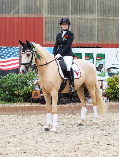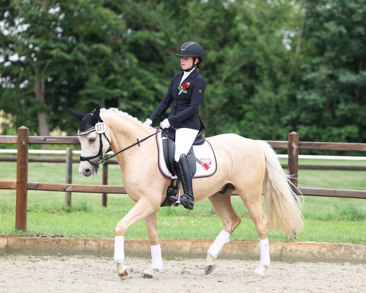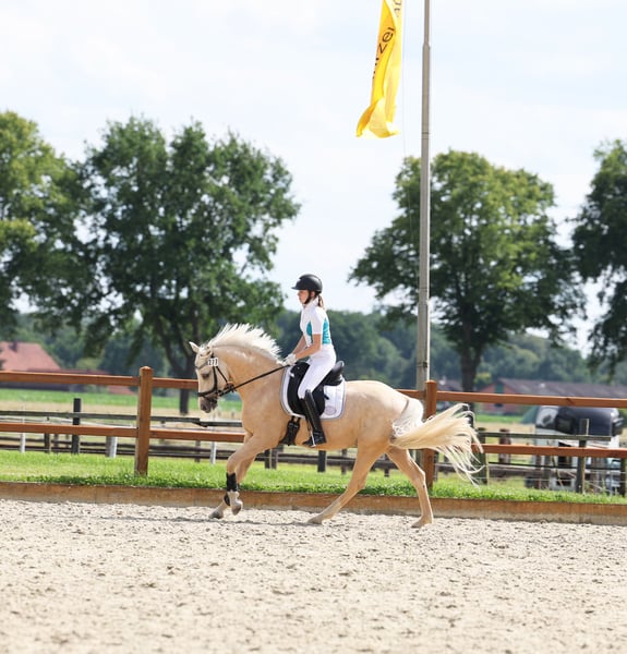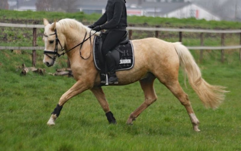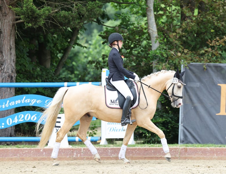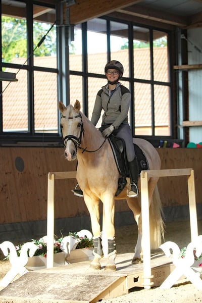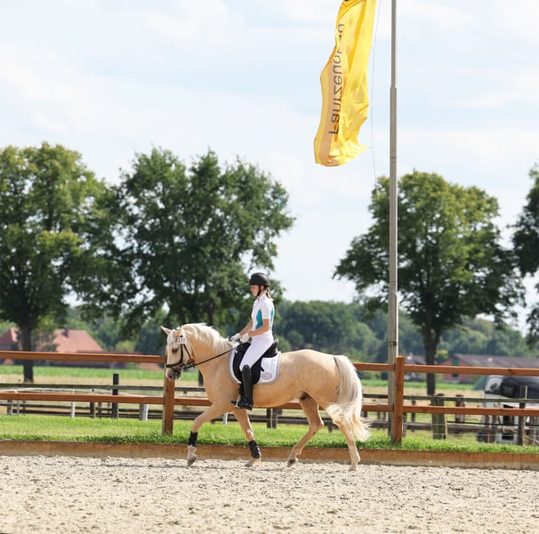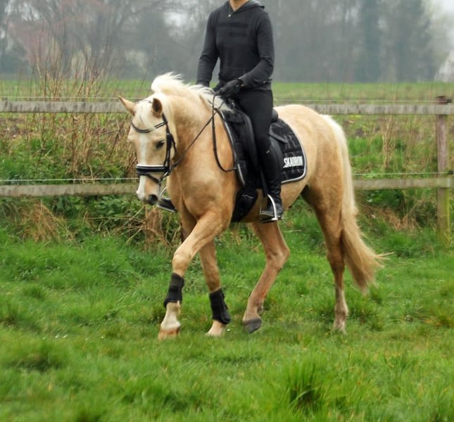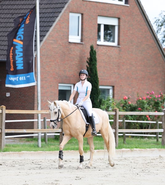 Djulyo wurde aufgrund seiner Größe erst spät angeritten und erst im letzten halben Jahr intensiver gefördert. Gerade hat er seinen ersten Turnierstart gemeistert und direkt eine Schleife mitgebracht. Er kennt sogar schon Mannschaftsreiten und liebt auch Anhänger fahren. Ideales Pony für kleine Erwachsene oder erfahrene Jugendliche mit feiner Hand. Er befindet sich jetzt auf sicherem A- Niveau hat aber wenig Lust zum Reiten. Am liebsten wird er nur 2 bis 3 mal die Woche geritten und am allerliebsten macht er Bodenarbeit oder Kunststücke. Er ist sehr intelligent, lernt schnell und möchte immer was neues machen. Nichts für Langweiler, sondern für jemanden, der eine Herausforderung sucht. Nur einmal Probereiten bringt bei ihm gar nichts, denn Leute die er nicht kennt, mag er erstmal nicht... man muss also öfter kommen und am besten sich auch mit ihm beschäftigen und nicht nur rauf und wieder runter. Er sucht sich seinen Reiter aus... Mit Dreieckszügeln ist er auch mit Kind im Unterricht schon gelaufen aber regelmäßig sollte er von einem erfahrenen Reiter weiter ausgebildet werden. Mit Springen sind wir jetzt gerade erst angefangen aber das macht er auch sehr gut. TÜV ohne Befund als er 3 war gemacht