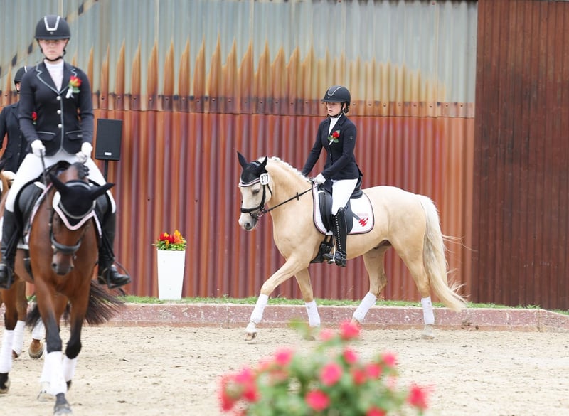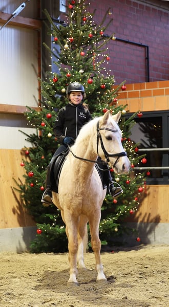 Djulyo, debido a su tamaño, fue montado con retraso y solo en los últimos seis meses ha recibido una preparación más intensiva. Acaba de debutar en competición y ha obtenido su primera roseta. Incluso ya conoce el trabajo en equipo y le encanta viajar en remolque. Es un poni ideal para pequeños adultos o jóvenes experimentados con mano delicada. Actualmente se encuentra en un nivel seguro de A, pero tiene poca motivación para montar. Prefiere ser montado solo 2 o 3 veces por semana y, sobre todo, disfruta del trabajo en el suelo o de hacer trucos. Es muy inteligente, aprende rápido y siempre quiere aprender algo nuevo. No es para personas aburridas, sino para quienes buscan un desafío. Solo una prueba de manejo no funciona con él, ya que no le caen bien las personas que no conoce... por lo que hay que visitarlo varias veces y, preferiblemente, dedicarle tiempo en el suelo, no solo montarlo y bajarlo. Él elige a su jinete... Con riendas en triángulo, ya ha montado en clases con niños, pero debería seguir siendo entrenado regularmente por un jinete experimentado. Acabamos de empezar a saltar, y también lo hace muy bien. TÜV sin informe, realizado cuando tenía 3 años.