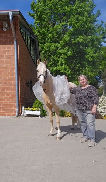 Djulyo was only backed later in life due to his size and has only been more intensively trained in the past six months. He has just competed in his first show and brought home a ribbon. He even knows team riding and enjoys trailering. An ideal pony for small adults or experienced young riders with a gentle hand. He is now at a secure A-level but has little enthusiasm for riding. He prefers to be ridden only 2 to 3 times a week and loves groundwork or tricks the most. He is very intelligent, learns quickly, and always wants to try something new. Not suitable for dull routines, but for someone seeking a challenge. A single test ride is not enough with him, as he initially doesn’t like people he doesn’t know. You need to visit several times and, ideally, spend time with him rather than just mounting and dismounting. He chooses his rider himself. With loose rein, he has already ridden in lessons with children, but regular training by an experienced rider is recommended. We have just started jumping, and he does that very well. He was health-checked with a TÜV when he was 3 years old, but no findings were reported.