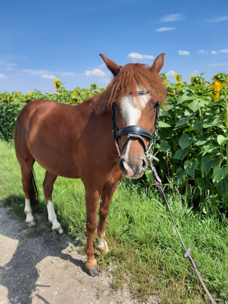 Zum Verkauf steht ein 8–jähriger deutscher Reitpony-Wallach. Er ist brav im Umgang und unter dem Reiter. Unarten wie Bocken, Steigen etc. sind ihm fremd und er will stets seinem Reiter gefallen. Er ist ideal für Freizeitreiter, da er im Gelände, alleine, sowie mit anderen Pferden brav und unerschrocken ist.Wir könnten ihn uns aufgrund seines lieben Charakters auch gut als Therapiepony vorstellen. Er ist aufgrund seiner Größe und seines Gebäudes kein Gewichtsträger (max. 55 kg). Mit anderen Pferden ist er sehr verträglich. Für das Probereiten werden 30 Euro berechnet, die beim Kauf verrechnet werden.