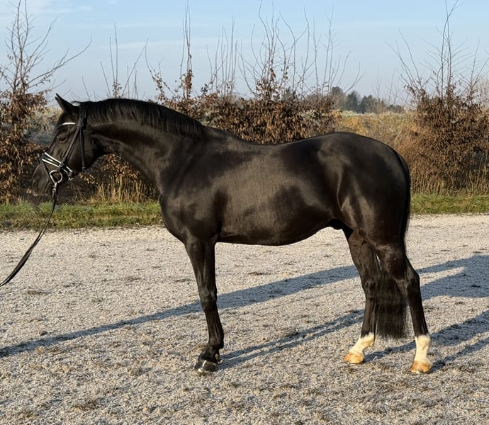 This stunning black stallion impresses not only with his flawless exterior but also with his excellent temperament and work ethic. He has already been placed in dressage competitions and has been carefully further trained towards FEI level. He masters all the movements, is very comfortable in the saddle, and exhibits a refined, soft contact. In handling and daily interaction, he is an absolute sweetheart, making him well-suited even for less experienced riders. A training video can be gladly requested via WhatsApp at 0172-5232822. A recent inspection report (TÜV) is also available.