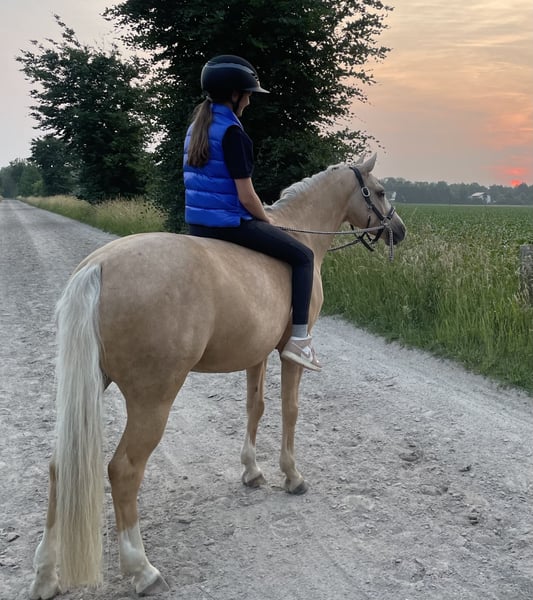 Schweren Herzens suchen wir für unseren 8 jährigen Ponywallach ein neues Zuhause. Touchi haben wir 4 jährig direkt von der Züchterin gekauft. Er ist gekört und hat sich 5 jährig für das Bundeschampionat qualifiziert. Aufgrund seines absolut lieben Charakters und seiner Gelassenheit können wir ihn uns gut als Kinderpony vorstellen. Aber er wäre sicherlich auch ein treuer Begleiter für einen kleinen Erwachsenen. Nicht nur beim Reiten, sondern auch im Umgang ist er absolut brav und verlässlich. Egal ob alleine oder in der Gruppe ausreiten, über Felder galoppieren, ins Wasser reiten, ohne Sattel reiten oder nur mit Halsring, er macht jeden Spaß mit! Auch kleine Sprünge machen ihm Spaß. Er ist täglichen Koppelgang mit Sozialkontakt gewohnt und sehr verträglich mit anderen Pferden. AKU aus 2021 liegt ohne Befunde vor. Leider fehlt uns für Touchi die Zeit, die er verdient. Deshalb wünschen wir uns für ihn ein ganz tolles neues Zuhause. Alles Weitere gerne per Telefon unter der 0172/8269899.