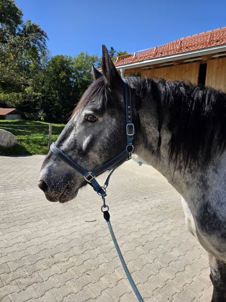 Herzenspferd sucht neues Zuhause! *Skadi, 9-Jahre, Noriker, Stute, Brandzeichen und volle Papiere.* Stockmaß ca. 1,60 m Vierfach beschlagen, kennt aber auch Duplos und Hufschuhe, Barhuf geht NICHT. Solides E-Niveau, kennt Kinder und Hunde und geht sorgsam mit ihnen um. Verlasspferd im Gelände. Schmiede- und Verladefromm, Straßensicher, kennt alle Bauernhofgeräusche und -Tiere, nur Esel mag sie nicht. Erste Festzugserfahrungen. Komplette Ausrüstung ist dabei. (Auf sie angepasster Kaltblut-Wanderreitsattel mit Mattes-Mondlammfellgurt, 2 Schabracken mit Moosgummi gegen das Rutschen, Fliegenhaube, Regendecke, Abschwitzdecke, Trense mit Gebiss und Zügeln, Hufglocken, Putzzeug, Hufschuhe usw.) Regelmäßig geimpft und entwurmt, regelmäßige Physiotherapie. Hatte bereits ein Fohlen. Vorreiten und Probereiten ist möglich. Kein Notverkauf, keine Händler, keine Reitschulen. Skadi ist eine lernwillige, mutige und fein zu reitende Stute, die liebevolle Strenge und reiterliches Können benötigt. Sie ist auch für Anfänger und Wiedereinsteiger geeignet, die wissen wie man klare Grenzen setzt. Sie fragt gerne nach, ist dabei aber nicht ungut oder böswillig. Sie braucht einfach eine klare Richtung.