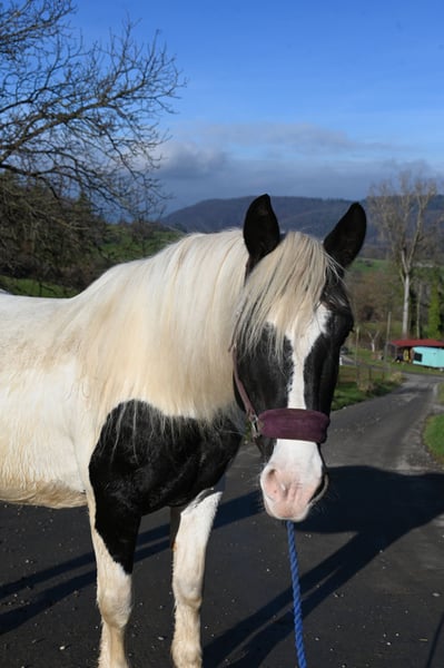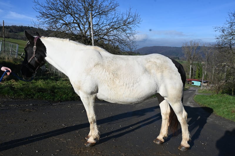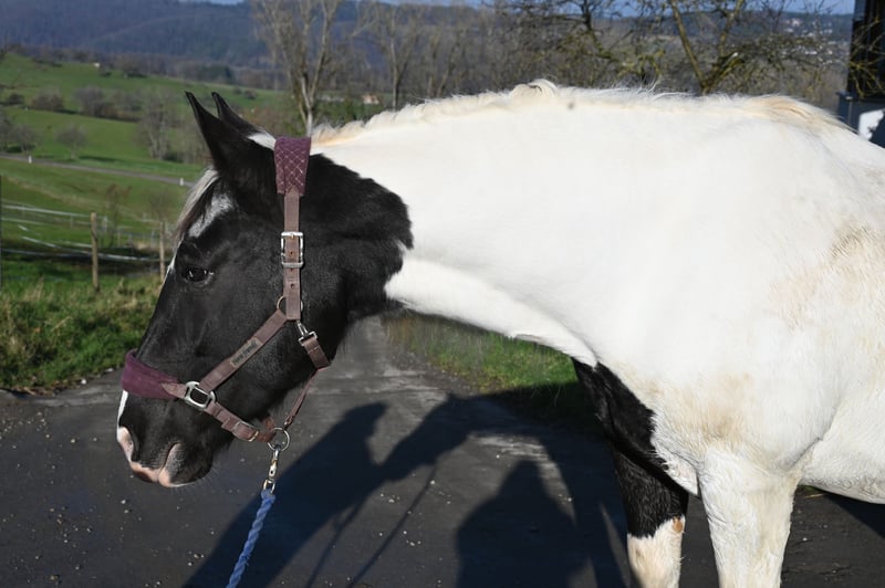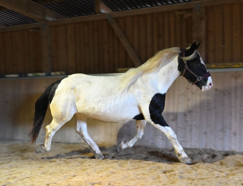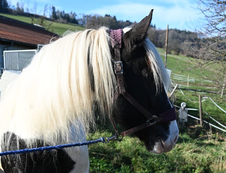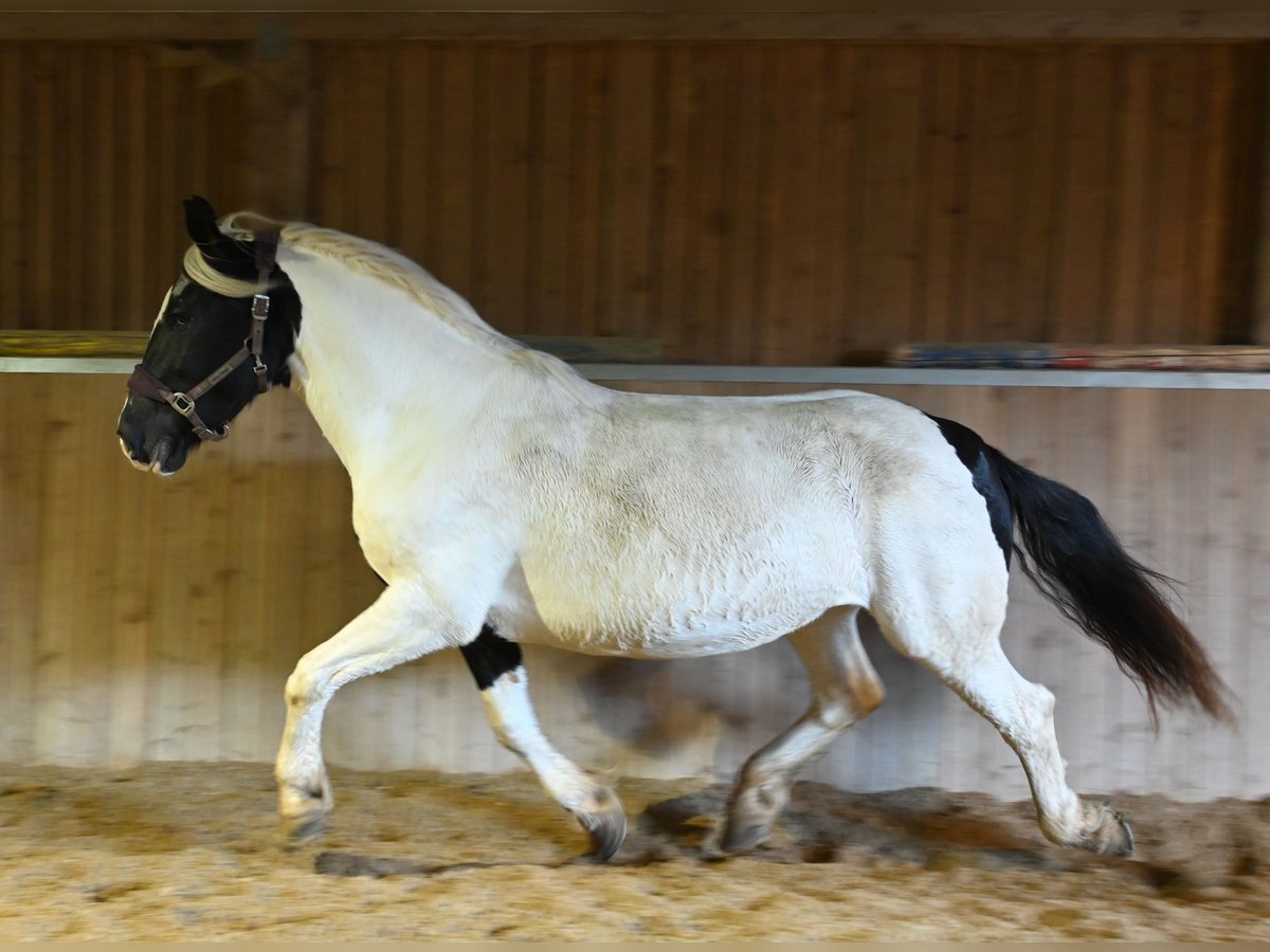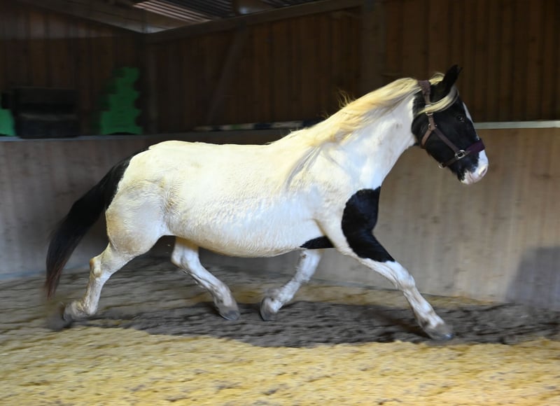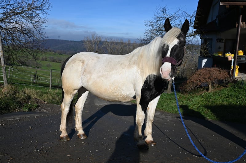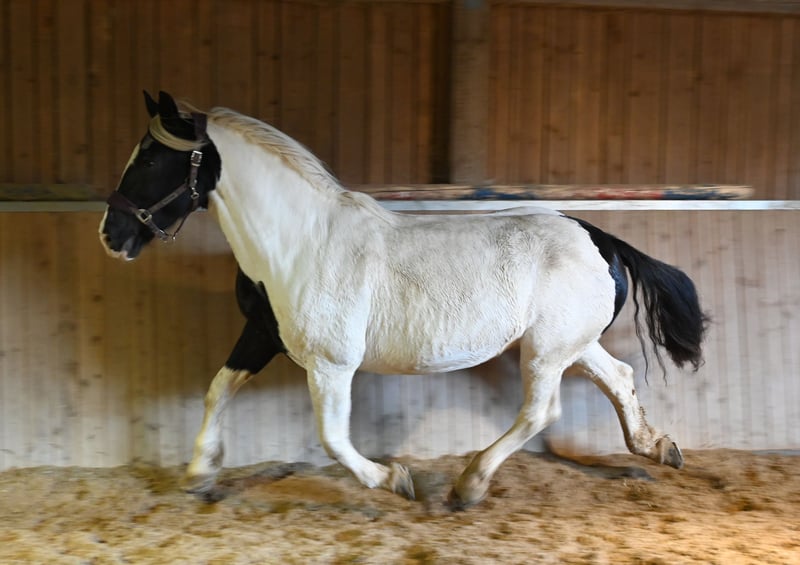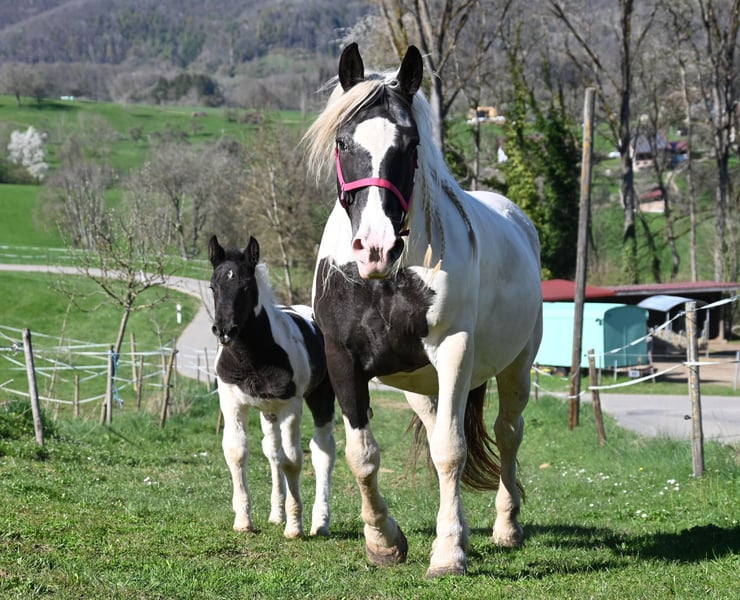 Jasmina was born on May 21, 2017, she is approximately 161 cm tall and has a very lovable and good-natured character. Additionally, she has an incredible charisma that captivates people. She is very well ridden, both in the arena and on trails. She is currently being used in our riding school and can also be ridden well by beginners. She is fearless and traffic-safe. Jasmina has been registered as a breeding mare in the studbook with a score of 7.50, and so far she has had 3 filly foals, 2 of which are pinto and one is a black foal, all of good quality. She is in foal to Hennessy Schaunitz for spring 2026. Jasmina has a good neck and a very well-split croup, good basic gaits with a very nice, spacious trot. She is shod all around and this should remain so; she has been tested free of PSSM1, vaccinated, and regularly dewormed. Jasmina loads calmly into the horse trailer and is farrier-friendly. Sire: Firon Elmar, Dam Sire: Lotto Vulkan