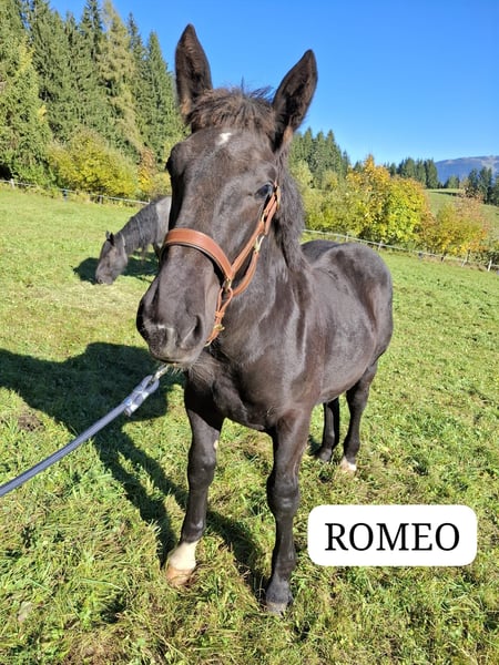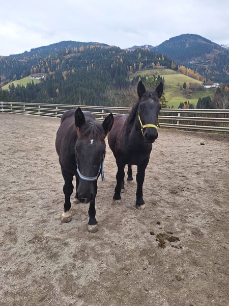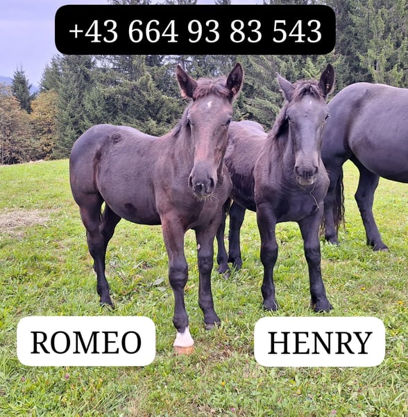 Henry und Romeo sind zwei aufgeweckte brave Rapphengstfohlen. Beide sind im April 2025 geboren. Henry gezogen nach Hofadel Schaunitz. Romeo gezogen nach Robin Nero. Die zwei beherrschen ihren alter entsprechend das Fohlen ABC: Halfter-führig, anbinden, Hufe geben, verladefromm, sie lassen sich am ganzen Körper streicheln. Generell sind die zwei sehr menschenbezogen, freundlich und ausgeglichen im Umgang. Später zwei perfekte Freizeit oder Arbeitspartner. Für die Entwicklung von Gleichgewicht und Kondition waren die zwei den ganzen Sommer über im Herdenverband auf der Alm. Da es zwei liebe Burschen sind würden wir uns freuen wenn sie ein neues liebevolles Zuhause finden würden. 📍 Standort: St. Johann im Pongau (Salzburg) 📞 Kontakt: Matthias Steinbacher +43 664 93 83 543 Gerne können die Fohlen nach Terminvereinbarung besichtigt werden.