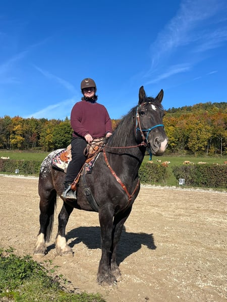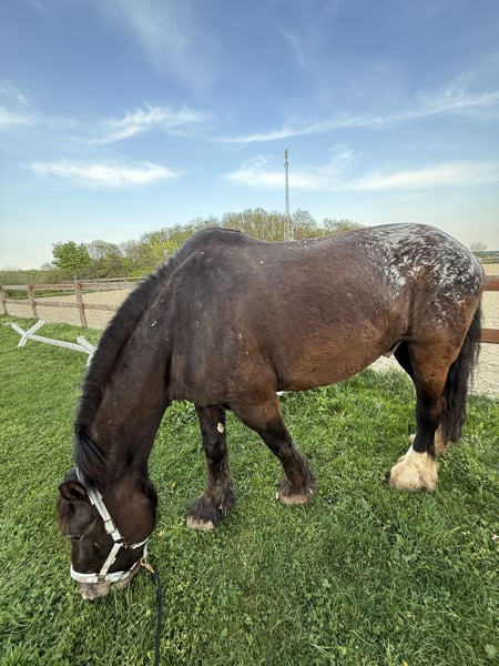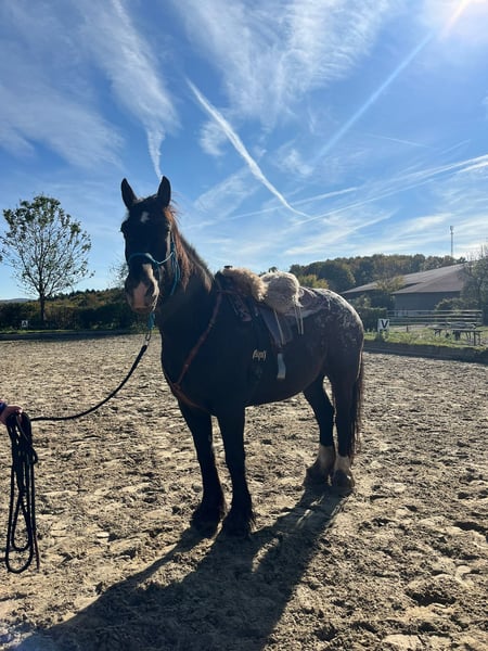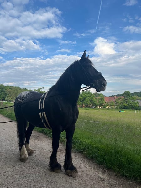 Aus persönlichen Gründen suche ich für meinen Nacho ein neues, liebevolles Zuhause. Nacho ist ein 12-jähriger Noriker-Shire-Mix (laut Vorbesitzer) mit einem Stockmaß von ca. 180 cm. Durch seine besondere Farbe und seine imposante Größe ist er ein echter Hingucker. Er ist seit 5 Jahren in meinem Besitz und wurde mit Unterstützung eingeritten. Aufgrund einer längeren, gesundheitlich bedingten Reitpause meinerseits benötigt Nacho aktuell einen ruhigen, sicheren Reiter, der ihm Vertrauen und Sicherheit vermitteln kann. Leider kann ich ihm das derzeit nicht bieten. Beim Reiten in der Halle muss man ihn etwas motivieren, da er den Sinn der Hallenarbeit noch nicht vollständig verinnerlicht hat. Im Gelände zeigt sich Nacho von seiner besten Seite: Er geht sehr gerne ausreiten, bevorzugt in Begleitung anderer Pferde, ist bei entsprechender Sicherheit aber auch alleine geländesicher. Bei seinem Vorbesitzer lief Nacho ein- und zweispännig vor der Kutsche. Bei mir war er nur wenige Male eingespannt, zeigte sich dabei jedoch sehr brav und zuverlässig. Besonders hervorzuheben ist seine Freude an der Bodenarbeit – neue Aufgaben und Tricks lernt er sehr schnell. Anfangs testet er gerne, doch wenn die Beziehung passt, arbeitet er motiviert und mit viel Herz mit. Vom Charakter her ist er eher ein großer Schmusehund als ein typisches Kaltblut. In der Herde ist Nacho rangniedrig und benötigt abends eine eigene Box, um zur Ruhe zu kommen. Nacho wird inklusive Zubehör und Westernsattel abgegeben. Da er sehr menschenbezogen ist und gerne arbeitet und ich ihm dies derzeit nicht in dem Maß bieten kann, habe ich mich schweren Herzens für einen Verkauf entschieden – zu seinem Wohl. In der Zeit bei mir war Nacho immer gesund und fit. Er ist aktuell barhuf, kennt aber auch das Beschlagen. Der Hängereinstieg ist problemlos, ebenso ist er beim Hufschmied brav. Mit Ungulat kann er auch Problemlos weiterhin Barhuf gehen. Nacho wird regelmäßig entwurmt und geimpft. Der Zahnarzt war das letzte Mal im Juli bei ihm. Mir ist ein 5-Sterne-Zuhause wichtiger als der Preis – kein Notverkauf. Anfragen von Händlern werden nicht beantwortet
