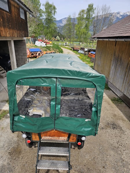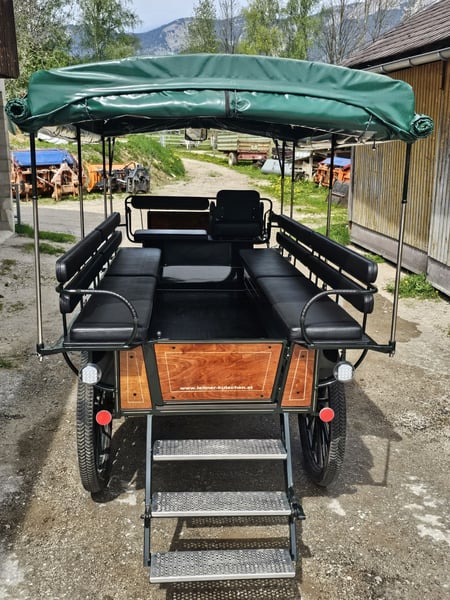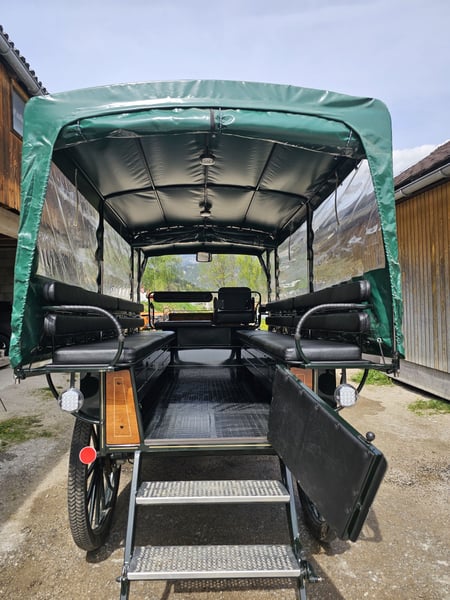 Platz für 12 Personen. Am Kutschbock können 2 Beifahrer mitfahren. Scheibenbremsen voll funktionsfähig, Luftbereifung, Blattfedern, LED Beleuchtung innen, Blinker und Licht vorhanden. Plane vollständig intakt. Dach kann abgenommen werden. Kutschenmasse: Länge 4800 mm, Breite1900, Höhe 2750mm inclusive Plane, Radabstand 1650 mm, Radgröße Hinten 1100 mm, Vorne 850mm, Bockhöhe 1600 mm. Wird wegen zu geringer Nutzung verkauft. Planwagen wurde mit 2 Kaltblüter gefahren.