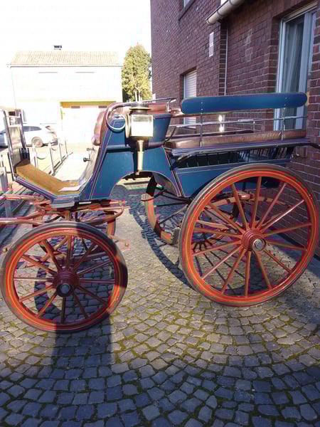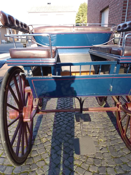Zum Verkauf steht eine wunderschöne, klassische Wagonette aus der Zeit um 1920. Diese Kutsche besticht durch ihre traditionelle Optik und ihre hohe Funktionalität – ein idealer Wagen für Gesellschaftsfahrten oder den stilvollen Freizeitfahrsport. Optik & Design: • Farbgebung: Edler dunkelblauer Aufbau kombiniert mit einem markanten, roten Fahrgestell und roten Rädern. • Kotflügel: Klassische Holzkotflügel, passend zum Gesamtdesign. • Polsterung: Die Sitze sind mit dunkelrotem Wischleder in hochwertiger englischer Knopfheftung bezogen, was der Kutsche eine besonders exklusive Note verleiht. Technische Details: • Baujahr: ca. 1920 • Räder: Original Holzräder mit Vollgummibezug (vorne 0,90 m / hinten 1,15 m Durchmesser) • Spurbreite: 1,40 m (bietet eine sehr sichere und stabile Straßenlage) • Bockhöhe: 1,60 m (für beste Übersicht des Fahrers) Besonderheit & Zustand: Das Besondere an diesem Modell: Die hinteren Sitzbänke können abgenommen werden, was die Kutsche sehr variabel im Einsatz macht. Der Wagen ist sehr gut gepflegt, weist lediglich leichte, authentische Gebrauchsspuren auf und ist sofort fahrbereit. Ein ehrliches, fahrbereites Fahrzeug für Liebhaber des traditionellen Fahrsports, die eine robuste und zugleich elegante Wagonette suchen.