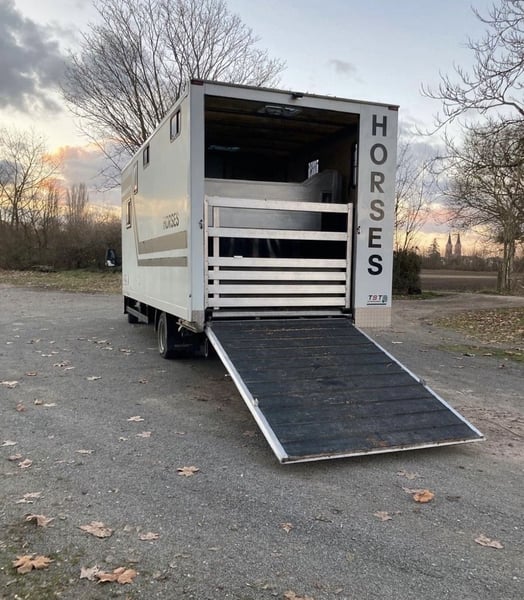 Trasporto cavalli Iveco Daily 70C17, senza pedaggio in Germania, immatricolato come veicolo speciale per camper, per 3 cavalli, cambio automatico, telecamera posteriore, gancio di traino, immatricolato a settembre 2015, allestimento come trasporto cavalli nel 2019, 136.000 km, revisione valida fino ad agosto 2026, peso totale 7,2 tonnellate, alta capacità di carico, ampio spazio di stivaggio, telecamera di sorveglianza nella zona cavalli, cabina abitativa con fino a 4 posti letto, doccia, fornello, lavello, frigorifero. Il veicolo si presenta in condizioni estetiche e tecniche molto buone. Tel.: 01520/2790298 Prezzo: trattabile