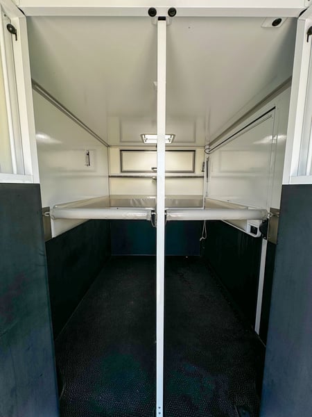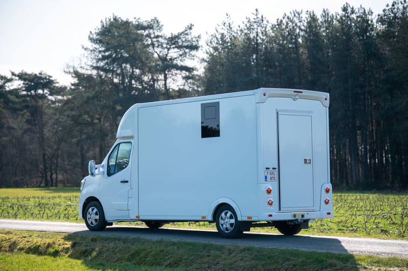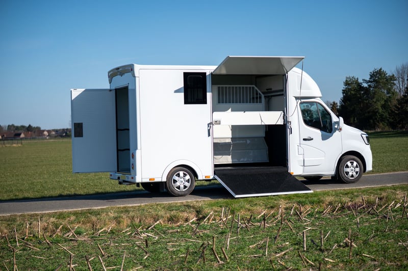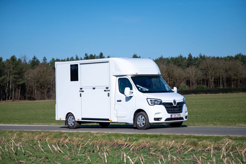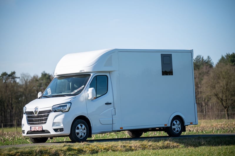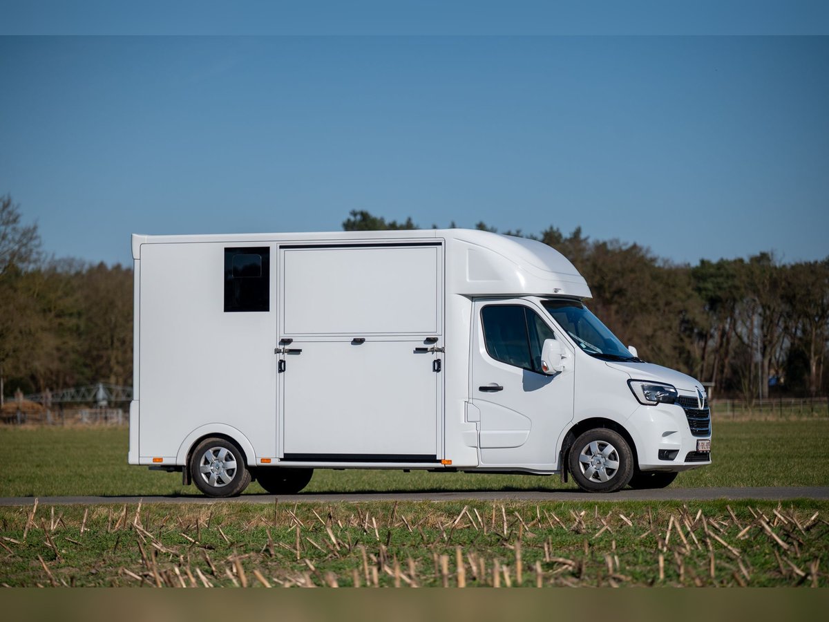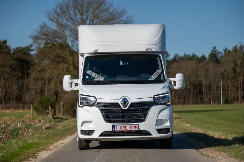 Nieuwe Ultra-light 2 paards Renault Master paardenwagen geschikt voor rijbewijs B met 1100kg laadvermogen. Uitvoering: Renault Grand Master Confort (L3), in mineraal wit, interieur aankleding in donker carbon, stoffen bekleiding "Kaleido", radiatorrosster in chroom afwerking, airco, DAB-radio, bestuurderszetel met armsteun en verstelbare lendensteun. Opbouw in hengstenuitvoering, verschuifbare tussenwand, klapbare tussendeuren, stootkussens, achteruitrijcamera en camera in laadbaak, LED verlichting laadbak blauw/wit, 2 dakluiken, dakventilator bedienbaar via cabine met temperatuur monitoring, anti-slip vloer met afloop, glas-in-glas design ramen met tralies, trekhaak 2500kg met 13-polige stekkerdoos, opstaptrede, dakspoiler met doorlaad mogelijkheid via laadbak, zijklep met kantelbaar dakluik, achterdeur, 2 zadelsteunen & 2 hoofdstelsteunen. Cruise Control optioneel mogelijk € 800 ex. BTW (in plaats van € 1600 ex. BTW)