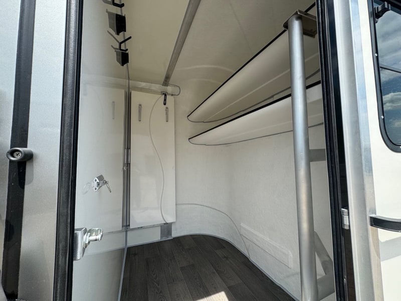 2 paardentrailers met zadelkamer 2,7 ton Uitvoering: 2 zitplaatsen, standaardversie met zadelkamer Gegalvaniseerd chassis Maximaal toegestaan gewicht 2700 kg; leeggewicht (1215 kg) Vloer uit aluminium Snaplock-profielen met een geplakte speciale rubberen bodemmat Volledig geïsoleerde zij- en dakpanelen van 30 mm dik, Aerodynamisch frontontwerp Afsluitbare instapdeur rechts met opklapbare opstap Zijluik met ventilatieluik erboven 2 schuiframen bij de paardenhoofden 1 langsschuifraam tegenover; 1 grote dakluik Verstelbare scheidingswand met halsstuk Plank bij de oprijplaat Doorlopende verwijderbare borststang Grote buitendeur aan de achterzijde Zadelkamer aan de voorkant met klapbed, 2 dekenrekken, teugel- en draaibare zadelhouder Certificaat van overeenstemming (COC) Video+++++Video+++++ https://youtu.be/I9t9Be9Mprg Optionele extra’s tegen meerprijs: Flankkussen Draadloze videocamera 220 Volt buitenaansluiting Aluminium opstaplijsten bij de oprijplaat Vervangwiel gemonteerd Direct beschikbaar Bezichtiging alleen op afspraak mogelijk Informatie via 01606106131 of 00491606106131