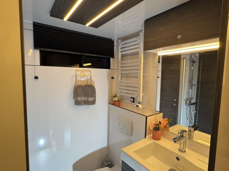 Neu und sofort verfügbar! Mercedes-Benz Actros 2545 RJH Exclusive H6 Pferdetransporter mit POP-OUT Actros 2545 Fahrgestell nach neuesten Standards und Vollausstattung, 450 PS, Automatik, Diesel, Euro6d, 26to. zulässiges Gesamtgewicht, AHK mit 3.500 kg Anhängelast, Abstandstempomat, Navigationssystem, komplette Luftfederung, Sitzheizung, Mirrorcams, etc. RJH EXCLUSIVE H6 Aufbau mit MEGA-SLIDE-OUT - zwei zusätzliche Drehsitze im Fahrerhaus und somit 4 Sitzplätze (insgesamt sind bis zu 6 eingetragene Sitzplätze möglich) - Großes separates Bad mit Dusche (Rain-Dance-Funktion möglich) und Keramiktoilette, Waschbecken und Badschrank - separater Schlafplatz über dem Bad - Entertainment-System mit Flat-Screen-TVs, automatischer SAT-Anlage (funktioniert auch mit 12 V, ebenso TV) - Komplette LED-Beleuchtung - Lederausstattung – Wände und Decke teilweise mit Skai-Leder bespannt - Insgesamt bis zu 6 Schlafmöglichkeiten und separates Pflegerabteil - Großer Führerhausdurchstieg – Dichtsystem mit 3-facher Sicherheit, absolut wasserdicht - Geräumiges Hochdach-Fahrerhaus mit elektrisch absenkbarem Kingsize-Bett - Aufbau und gesamte Technik sind absolut winterfest bis min. -20°C! (geeignet und erprobt für den professionellen Einsatz) Pferdeabteil - Pferdeabteil für bis zu 6 Pferde, Seilwinde, Heck- und Seitenrampe mit Rampenbegrenzer - Edelstahlspezialtrennwände mit neuem System komplett ohne Trog - Zwei mechanische Easy-Lift Rampen (seitlich und hinten) mit integrierter Verriegelung und Rampenbegrenzern aus Aluminium - Überwachungskamera im Pferderaum und Rückfahrkamera - Zwei große aufstellbare Dachhauben, Schiebefenster auf der Fahrer- und Beifahrerseite, sowie zwei Profi-Elektrolüfter für eine angenehme Luftzirkulation - mehrere isolierte Staufächer (somit wasserdicht und ohne Feuchtigkeitsbildung) und Außensattelkammer für Sättel und Trensen, sowie Deckenablagen - Aufbau ebenfalls voll isoliert und winterfest und dadurch für die Pferde auch an heißen Tagen deutlich kühler Weitere Informationen und Bilder erhalten Sie jederzeit gerne auf Anfrage! Besuchen Sie uns für eine Besichtigung und professionelle Beratung zu unseren Fahrzeuge nach Terminvereinbarung! RJH-Prospekt mit allen Fahrzeugen gedruckt oder digital nach Anfrage erhältlich. Die Roland Bauer Unternehmensgruppe bietet Ihnen ständig zwischen 15-20 Pferdetransportern in allen Kategorien und Größen. Irrtümer und Zwischen vorbehalten.