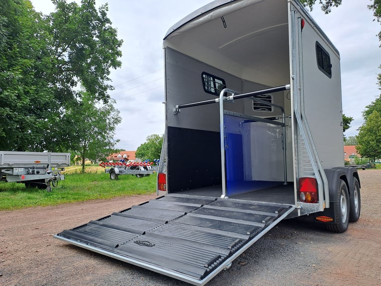 We are selling a new Böckmann Portax Esprit ECO in slate gray metallic with equipment package!! - Permissible total weight: 2400 kg - Payload: 1557 kg - Unladen weight: 843 kg - Support wheel automation - CFF-Plus chassis including wheel shock absorbers - Color: anthracite metallic - Saddle box with extendable saddle holder and broom/shovel net/mirror - Rubber on loading flap (integrated step strips) and side stop - Side step protection - Opening windows at an angle on the front right and left - Tarpaulin lift - Large entry door on the right, lockable / 3-point closure - Original Böckmann full aluminum floor - Interior lighting blue / white - Lighting system with reverse light and 13-pin connector - Price includes VAT. More new and used horse trailers in stock! Shipping of vehicle registration documents for registration possible for an additional €5 in advance! Delivery by arrangement, trade-in and financing gladly possible Viewing/pick-up in 16845 Großderschau by appointment at 033875-909588 anytime possible! Opening hours: Monday - Friday 8:00 AM - 5:00 PM