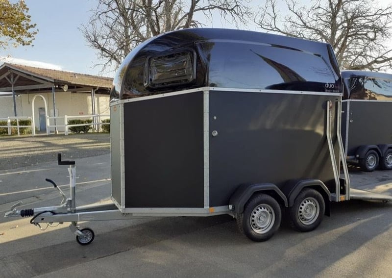Marque: Bockmann Modèle: DUO Esprit Silver+Black Année: 2021 Première main: Oui Etat: Neuf Capacité: 2 Chevaux Pont Arrière. Chevaux voyagent: Tête avant Van BOCKMANN DUO ESPRIT Silver+Black avec pack luxe (2 places) EN STOCK . Parois plywood couleur gris granit . Toit en polyster gris métallisé . Barre de poitrail anti-panique . Bâche arrière manuelle . Roue de secours avec support . Roue jockey automatique . Tête d’attelage sans antivol (disponible au prix de 35€TTC) . Adaptateur 7/13 poles . Fenêtres rectangulaire ouvrables