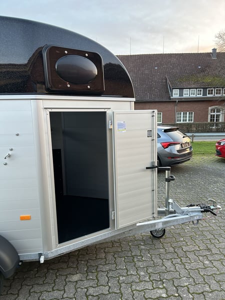 Humbaur Equitos Alu 2000 Pferdeanhänger PKW Anhänger Alter: Neu (Produktionsjahr: 2025) 2 Jahre Hauptuntersuchung ab dem Tag der Erstzulassung Inkl. Zulassungspapiere (Kfz-Brief / Zulassungsbescheinigung Teil 2 und COC) Verfügbar ab: Ca. 6 Wochen nach Bestelleingang (unverbindlich) Finanzierung über unsere Partnerbanken möglich! Technische Daten Zulässiges Gesamtgewicht: 2.000kg Leergewicht: ca. 773kg Nutzlast: ca. 1.227kg Achsenanzahl: 2 Laderaumlänge: 3.157mm Laderaumbreite: 1.654mm Laderaumhöhe: 2.300mm Bremsenart: Gebremst, Auflaufbremse Fahrgestell: Tieflader (Räder neben Aufbau), Gummifederachsen Elektrik: 12V, 13 poliger Stecker Reifengröße: 175/70 R13 Sonderausstattung EquiDrive® Fahrwerk inkl. Radstoßdämpfer (100 km/h-Zulassung) Seitentrittschutz Auflaufklappe mit Trittleistengummi Geteilte und höhenverstellbare Brust- und Heckstangen mit Panikentriegelung EquiLock® verriegelbare Trennwand Serienausstattung Alu-BiComp-Boden 21mm (kein Holz - unverrottbar) Gummiboden 8mm stark Aufbau aus doppelwandigen, eloxierten Aluminiumprofilen Heckabstützung mit Beleuchtung Einstiegstür mit 3-Punkt-Verriegelung Getönte Ausstellfenster in Polyhaube Polyhaube in Black Metallic Innenbeleuchtung Heunetzring Windschott Automatisches Stützrad Rahmen verzinkt V-Deichsel AL-KO oder Knott Achsen und Bremsanlage Zubehör (aufpreispflichtig) Alufelgen Silver / Black Sattelablagestange für 2 Sättel (außen) Schwenkbare Sattelablage für 1 Sattel (außen) Dachfenster Heckklappe mit Trittleistengummi Fohlengitter Hecktür dreh- und schwenkbar Durchgehende Boxenstange zum Fohlentransport Trittschutzgummi für Sattelkammer Seitenpolsterung links und rechts Kopftrennwand für Mitteltrennwand Abschließbare Sattelkammer mit Sattel- und Trensenhaltern, Futtertrögen, Spiegel und Staunetz Planenrollo PVC anstatt Windschott EquiLock verriegelbare Trennwand Verschleißmatte vorne Verschleißmatte hinten Anhängerschloss Reserverad 175/70 R13 inkl. Reserveradhalter Fahrzeuganlieferung deutschlandweit Zulassung deutschlandweit Überführungskennzeichen (5 Tage gültig) Hinweis Gewichtsangaben können je nach Ausstattung abweichen; Irrtümer, Zwischenverkauf und Änderungen vorbehalten!