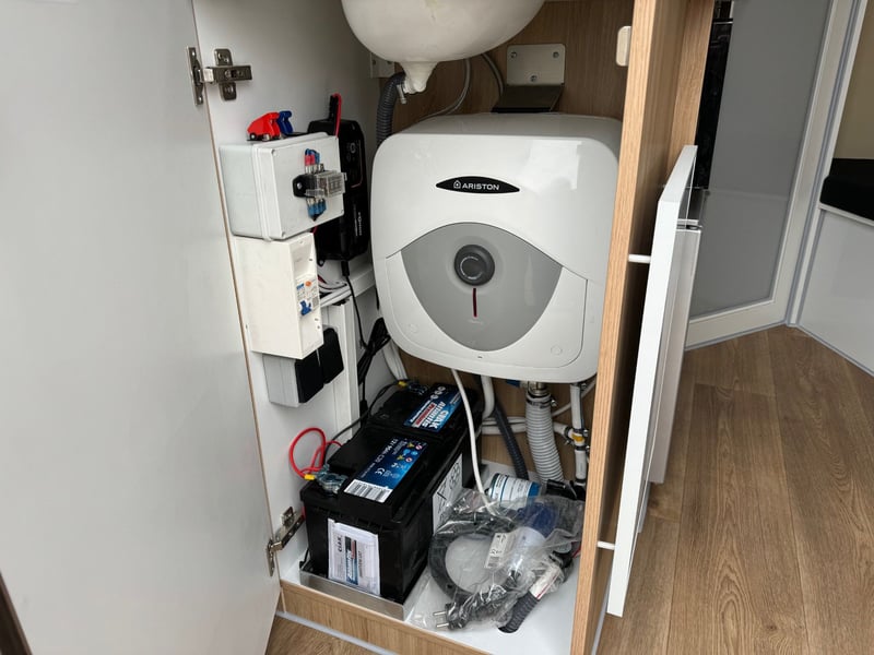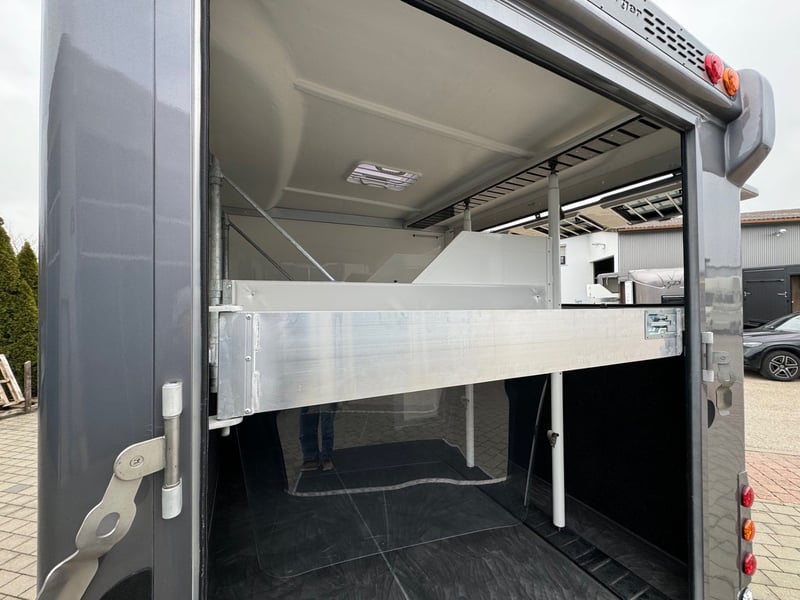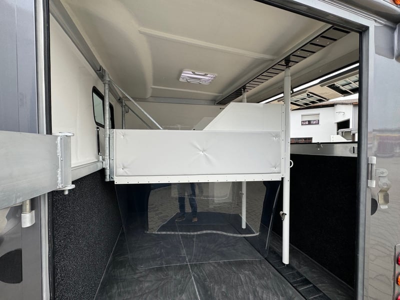 3-horse trailer taifungrau with living compartment AVAILABLE IMMEDIATELY Arrange a viewing appointment quickly! This fully equipped trailer for 3 horses with living compartment is available immediately. Permissible total weight 3.5t ball head, total length 6.00m, body length 4.50m, total height 3.20m. 3 parking spaces, 5 side windows, the side flap can be fully opened for ventilation or for the well-being of the horses on hot show days. Access to a prepared living/saddling area, which can also be accessed separately from the outside through a door with window. Rear spoiler with additional lighting for safety on the road. The partition walls are hinged and made of aluminum profile with PVC curtains, convertible into a box. The horses' loft area, approx. 1.20 high, is covered with rubber. Feed bucket can be hooked in. Extremely low ramp height, making it very easy to load the horses. 2 seats in the living area, lowerable table, can be converted into a bunk bed for 2 people, side door with window, hinged window, 220 volt external connection with additional battery, charger, water pump and boiler, hinged window, roof hatch Kitchenette with fridge, microwave/ceramic hob, sink, shower On request also with TV, electric heating, air conditioning! A great trailer with comfort separately for the car or as an additional loading option behind your horsebox - also available with higher tires. Viewing only possible by appointment Available immediately Inquiries under 01606106131---00491606106131
