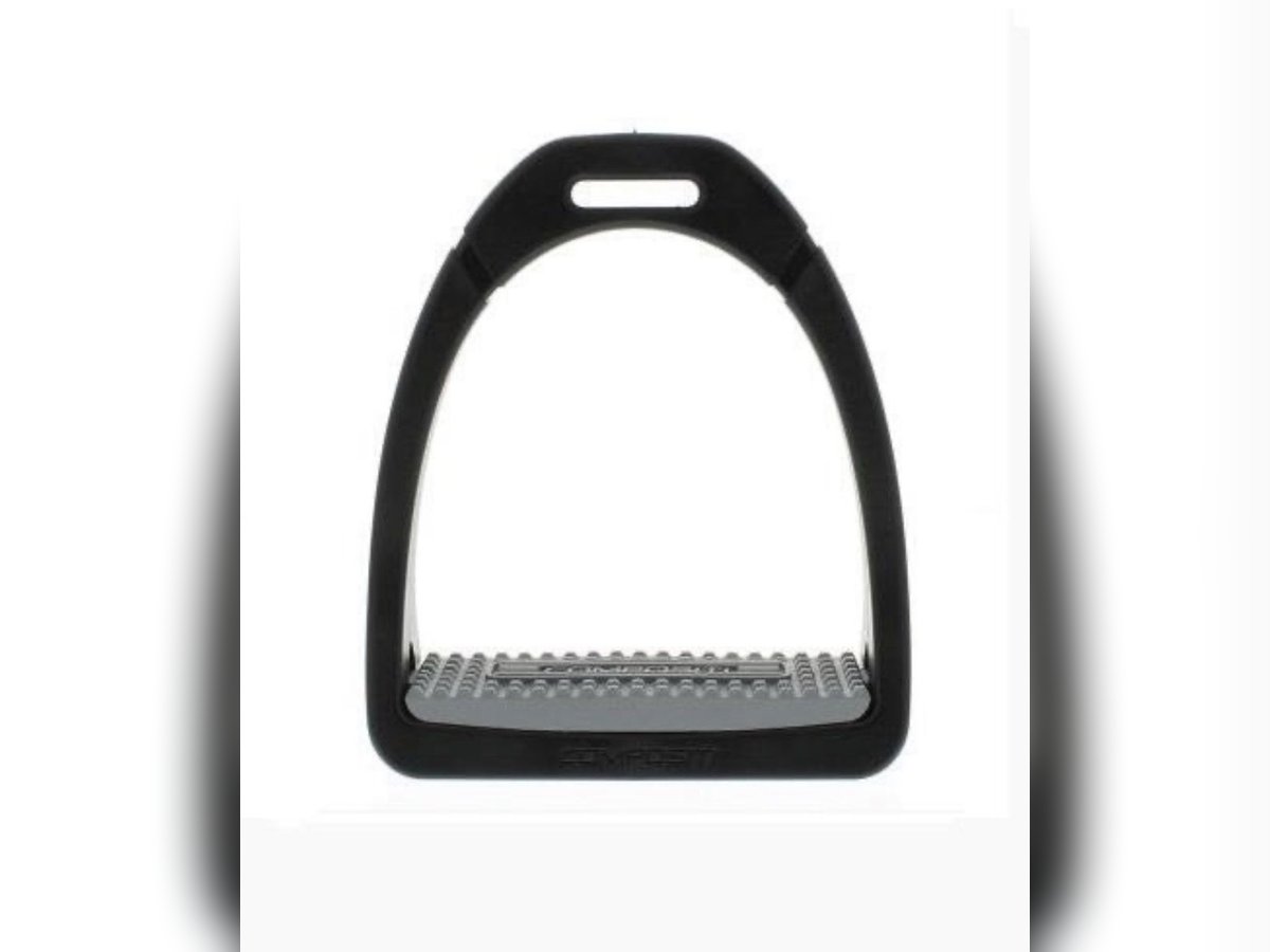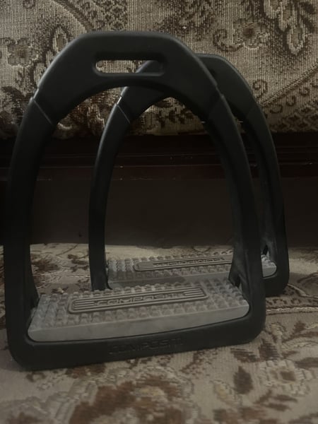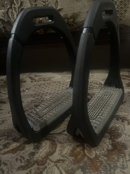 Strzemiona Compositi, plastikowe bardzo lekkie. Nie stukaja o kostke. Szerokosc strzemion 14cm.