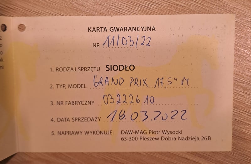 • Firma: Daw Mag • Model: Grand Prix • Rok produkcji: 2022 • Szerokość siedziska: 17,5" • Szerokość łęku: M z przedłużoną tybinką • Stan: bardzo dobry, mało używane, widoczne lekkie ślady po puśliskach • W komplecie z oryginalnym pokrowcem Nowe siodło kosztuje ok. 6800zł • Cena: 3900zł Odbiór osobisty w Poznaniu lub wysyłka kurierem (cenę pokrywa kupujący) Możliwość przymiarki (kaucja w równowartości ceny - szczegóły do ustalenia) Numer telefonu: +48 601 661 203 Email: mj01@onet.eu
