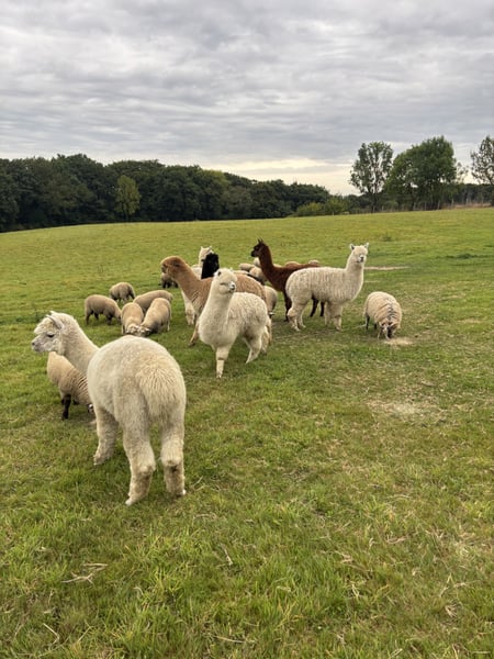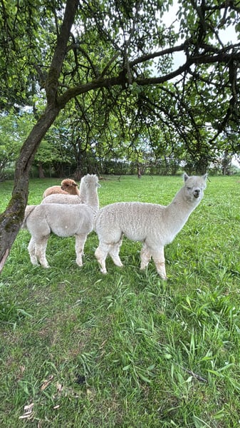 7 Brave Alpakas 2 Stuten Tragen möglich ohne Garantie und 5 Wallache im Alter zwischen ca. 3 Jahre und 9 Jahre Robust gehalten kennen sonst alle weide Tiere . Preis bei Gesammt Abnahme 3600€ zum Ausuchen Sprechen .