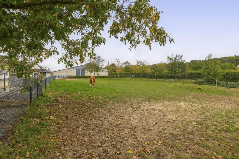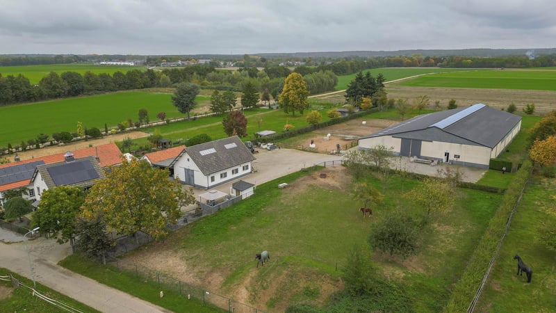 Discover this compact equestrian accommodation! The detached, lifetime-proof house with a separately accessible flat/studio, ideal for grooms or stable staff. The spacious detached riding hall is equipped with a reception area, 14 horse boxes of various sizes and an indoor arena. Various paddocks and a pasture offer your horses plenty of space in a peaceful environment. Located near a vast forest area, perfect for endless riding opportunities and equestrian trails. The property is very conveniently located for international airports such as Düsseldorf, Eindhoven, Maastricht and Aachen – ideal for horse transport. A perfect combination of living comfort, equestrian sports and excellent accessibility! In short, an ideal opportunity for the (semi)professional horse lover! RESIDENCE Ground floor: The spacious entrance hall provides access to the kitchen and the meter cupboard. There is also a staircase to the first floor. The hall has a tiled floor, stucco walls and a stucco ceiling. The kitchen and living room, which are open plan, have tiled floors, stucco walls and stucco ceilings. This living room enjoys a great deal of natural light. The complete preparation for an attractive fireplace is already in place and ready for use. The kitchen, in a clear corner layout, is fully equipped. Think of a sink, a 5-burner gas hob, dishwasher, combi oven/microwave, refrigerator and freezer. French doors in the kitchen lead to the patio terrace, which also has a garden shed with a tiled floor. This garden shed is currently furnished as a relaxing wellness room. On the ground floor, you will also find a spacious bedroom with large windows, which guarantee plenty of natural light. The bedroom has its own en-suite bathroom, complete with shower, bath, toilet and double washbasin. This makes the property suitable for all stages of life. The kitchen also provides direct access to the rear porch. From this porch, there is access to the toilet and a door leading to the yard. The porch is equipped with a practical washbasin. First floor: On the 1st floor, you will find a spacious studio, which was created by combining two bedrooms. This bright, open space is furnished with a practical kitchen unit with built-in cupboards and a stylish worktop, as well as a combined sitting and sleeping area. Would you prefer two separate bedrooms? This space can easily be divided back into two separate bedrooms. In addition, on this floor you will find a well-maintained, separate bedroom and a modern bathroom, complete with shower and toilet. A hatch provides access to the attic where the inverter for the solar panels is located. STUDIO/APARTMENT A separate staircase on the outside of the house leads to a charming studio/apartment. This cosy and bright space consists of a living room/bedroom with stylish laminate flooring, a practical kitchen and a bathroom. The living room/bedroom benefits from a dormer window and a skylight, which provide plenty of daylight and pleasant ventilation. The practical kitchen is equipped with a sink, hob, refrigerator and ample cupboard space. The bathroom is accessible from the kitchen. It is equipped with a shower, washbasin with cabinet and a toilet. This studio offers an ideal and efficient living space, perfectly suited as accommodation for grooms or stable staff, for example. GARAGE The detached garage is equipped with a carport/shed on the left-hand side. The garage is constructed of masonry facades with steel trusses and an insulated roof. The garage is finished with a concrete floor and a wooden beam ceiling. A sliding door at the front and rear provides access to the yard. There is a laundry room and a storage room (former tack room) with a fuse box. A fixed staircase provides access to the attic, which offers even more storage space. This multifunctional building offers various possibilities for storage, hobby space or other applications. RIDING HALL WITH STABLE AREA The detached riding hall is constructed from concrete elements with a masonry profile with steel trusses and a corrugated roof (asbestos-free). The riding hall is also equipped with an indoor arena, a reception area and a stable area with a total of 14 horse boxes. The reception area has a tiled floor, stucco walls and a suspended ceiling. There is a bar with a kitchenette. The kitchenette is equipped with a sink, connections for electricity and washing equipment, and a boiler (Daalderop). There are also two toilet areas and a shower room. These are fully tiled. The reception area offers a beautiful view of the indoor riding arena. A door provides access to the stable area and the riding hall. To the left of the reception area is a storage space for a trailer or lorry, for example. Extra high sliding doors of approx. 4 metres high have been installed specifically for this purpose. The space is currently furnished with 4/5 extra horse stalls. These stalls are equipped with partly plastic/partly galvanised front walls with sliding doors. The tack room has a concrete floor, brick walls and a panelled ceiling. The stable area on the left is equipped with 10 horse stalls. These stalls are fitted with partly plastic/partly galvanised front and partition walls with sliding doors. The rear walls are made of concrete. The adjacent indoor arena, measuring approx. 20m x 40m, offers ideal conditions for training or competitions thanks to its sand floor and stylish wooden edging. The use of sprinkler hoses ensures an optimal climate. A skylight in the ridge provides plenty of natural light. There is also open ridge ventilation. The windows on the side wall are blinded. A sliding door in the rear wall provides access to the yard. OTHER FACILITIES The yard is further equipped with various paddocks, pasture and a manure heap. The three sand paddocks are fenced with wooden posts and ribbon. The grass paddock has a wooden fence with wire mesh. Here you will also find several fruit trees that add colour and atmosphere to the surroundings.