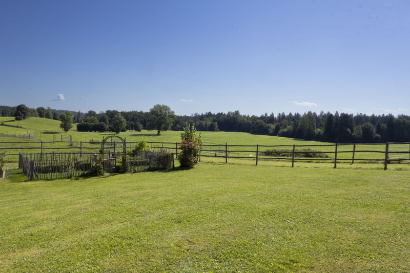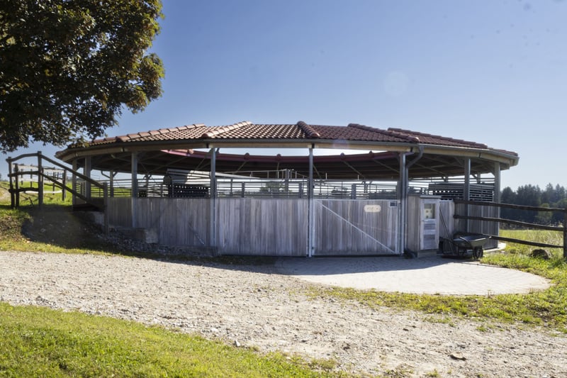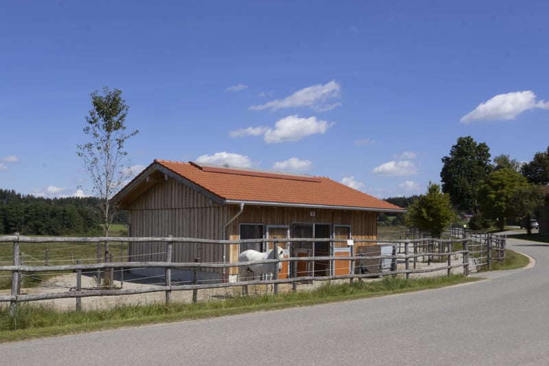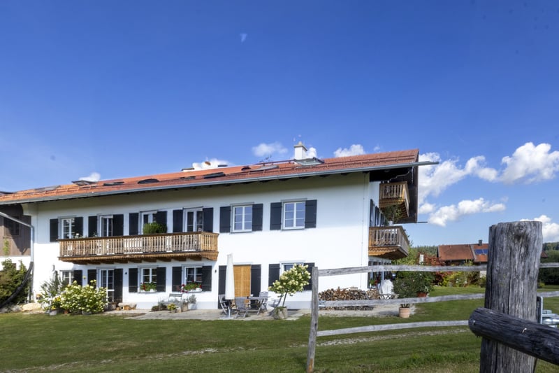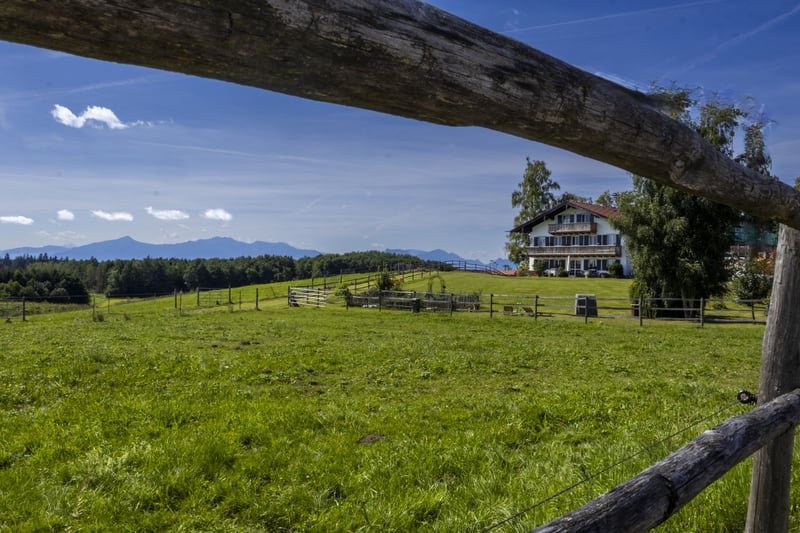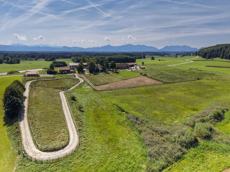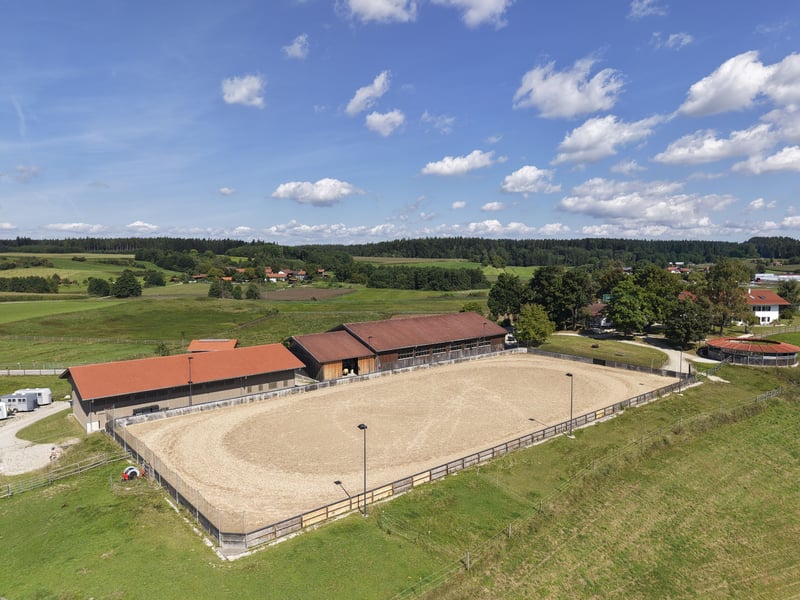 Der exklusive Pferdebetrieb befindet sich auf einer sanft ansteigenden Anhöhe und bietet einen beeindruckenden Panoramablick auf die Alpenkette. Er ist ausschließlich über eine wenig befahrene Straße erreichbar. Das Anwesen besticht durch einen atemberaubenden Fernblick in die umliegende, sich weit öffnende Naturlandschaft. Das Gesamtareal erstreckt sich über knapp 19,4 Hektar und umfasst Weideflächen, Wiesen sowie Waldgebiete. Das Areal umfasst ein Hauptwohngebäude mit drei separaten Wohneinheiten, deren Wohnflächen zwischen 145 und 195 m² variieren, auf einem Grundstück von 1.330 m². Zusätzlich steht ein weiteres Holzständerhaus aus dem Jahr 1995 mit etwa 170 m² Wohnfläche sowie rund 100 m² Nutzfläche auf einem 874 m² großen Grundstück zur Verfügung. Beide Gebäude sind hochwertig ausgestattet, unter anderem mit Böden aus Holz und Stein, einer modernen Pelletheizung beziehungsweise Fernwärme, Fußbodenheizung sowie umweltfreundlicher Dämmung. Zum Betrieb gehören außerdem eine Personalunterkunft mit circa 100 m², eine derzeit im Bau befindliche Tennenstallhalle mit einer Fläche von 340 m², ein Querstall mit insgesamt 17 Paddockboxen, eine Mistlege, drei Außenställe mit jeweils vier Paddockboxen sowie eine Führanlage von 220 m². Die großzügige Reithalle misst 20 x 40 Meter, ist modern beleuchtet und bewässert und wird durch einen Anbau als Lagerraum ergänzt. Eine im Jahr 2023 errichtete Betriebshalle bietet ausreichend Platz für Maschinen, eine Tankanlage sowie die Lagerung von Stroh und Heu. Der weitläufige Reitplatz mit einer Größe von 3.600 m² ist ebenfalls mit einer Beregnungs- und Beleuchtungsanlage ausgestattet. Es eignet sich hervorragend für anspruchsvolle Pferdeliebhaber, die großen Wert auf Komfort und Funktionalität legen. Ausstattung: Hauptwohnhaus mit drei Wohneinheiten - 3 separate Wohneinheiten zwischen 145 m² und 195 m² - Grundstück Wohnhaus ca.1.330 m² - Komplett unterkellert - Baujahr 2018 - Hochwertige Holzböden und Steinböden - Pelletheizung - Hochwertige Bäder - Großzügiger Garten und Balkone mit Panoramablick Wohnhaus in Holzständerbauweise - Baujahr 1995 - ca. 170 m² Wohnfläche und ca. 100 m² Nutzfläche, - Grundstück Holzständerhaus ca. 874 m² - Fußböden aus Holzdielen und Steinböden - Fußbodenheizung EG und Heizkörper im OG - Grundofen im EG - Fernwärme Pellets Betriebsbereich - Unterkünfte für Stallpersonal - Sattelkammer - Reiterstube mit Küche und WCs Tennenstall - befindet sich im Bau (Fertigstellung Ende 2025) - ca. 340 m² Nutzfläche - 4 Paddockboxen Querstall mit Lager - ca. 330 m² Nutzfläche - 17 Paddockboxen Mistlege - ca. 120 m² Nutzfläche Reithalle - ca. 890 m² Nutzfläche - 20m x 40 m - ca. 130 m² Nutzfläche als Lagerfläche Betriebshalle -Baujahr 2023 - ca. 370 m² Nutzfläche Außenställe - Baujahr 2024 - 3 Außenställe à 100 m² mit je 4 Paddockboxen Führanlage - Baujahr 2016 Reitplatz - ca. 3.600 m² Nutzfläche (90m x 40m) Lage Das Grundstück liegt nur wenige Autominuten vom Chiemsee entfernt, oberhalb des malerischen Ortes Oberbrunn, der vor allem durch sein reizvolles Schloss bekannt ist. Es befindet sich am Rand der attraktiven Eggstätter Seenplatte und gehört zur Gemeinde Pittenhart. Pittenhart selbst ist nur wenige Kilometer entfernt und präsentiert sich als eine ruhige, ländliche Ortschaft mit einer dennoch gut ausgebauten Infrastruktur. Dort gibt es unter anderem einen Kindergarten, eine Grundschule sowie verschiedene Einkaufsmöglichkeiten wie einen EDEKA-Markt, eine Bäckerei und eine Tankstelle. Für weitergehende Bedürfnisse stehen in den umliegenden Orten umfangreichere Angebote bereit. So findet man dort weiterführende Schulen, medizinische Versorgungszentren und Kliniken, die eine umfassende Gesundheitsversorgung garantieren. Diese Einrichtungen befinden sich in Städten und Gemeinden wie der Kreisstadt Traunstein, Obing, Wasserburg, Rosenheim, Traunreut, Bad Endorf sowie Prien am Chiemsee. Auch kulturell hat die Region einiges zu bieten: Das nahegelegene Kloster Seeon sowie das Schloss Amerang veranstalten regelmäßig abwechslungsreiche kulturelle Veranstaltungen und bieten somit vielfältige Möglichkeiten zur Freizeitgestaltung. Ebenso ist der Chiemsee mit dem berühmten Schloss auf der Herreninsel und dem Kloster auf der Fraueninsel in wenigen Minuten erreichbar und lädt zu Ausflügen sowie Erholung am Wasser ein. Prien am Chiemsee und Bad Endorf verfügen über IC- und Regionalbahnhöfe mit direkten Verbindungen nach München sowie Salzburg und deren Flughäfen. Der Autobahnanschluss befindet sich in Bernau, was eine schnelle Erreichbarkeit weiterer Ziele ermöglicht. In unmittelbarer Nähe des Anwesens verkehren zudem ein Schulbus sowie eine reguläre Buslinie, die den öffentlichen Nahverkehr ergänzen und Mobilität auch ohne eigenes Fahrzeug sicherstellen. Energieausweise liegen vor Wohngebäude Haupthaus/Verbrauchsausweis: Baujahr 2018, Baujahr Wärmeerzeuger 2013, Pellets, Endenergieverbrauch 46kWh/(m²a), Energieklasse A, CO² Emission 0,92kg/(m²a). Wohngebäude Holzständerhaus/Verbrauchsausweis: Baujahr 1995, Baujahr Wärmeerzeuger 2013, Fernwärme, Endenergieverbrauch 146,4kWh/(m²a), Energieklasse A, CO² Emission 29,3kg/(m²a). Provision Die Käufercourtage in Höhe von 3,75% auf den Kaufpreis einschließlich gesetzlicher Mehrwertsteuer ist bei notariellem Vertragsabschluss verdient und fällig.