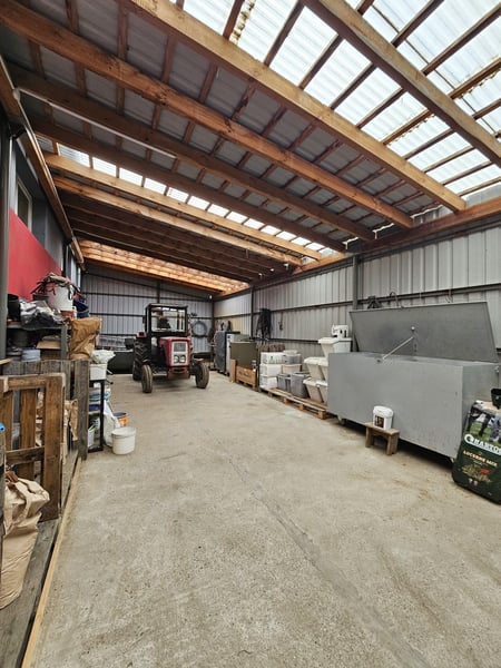 Hala łukowa na siano i słomę (wybudowana 2024 r.): 30m x 12m, wysokość 7m, pomieści 600-800 bali
