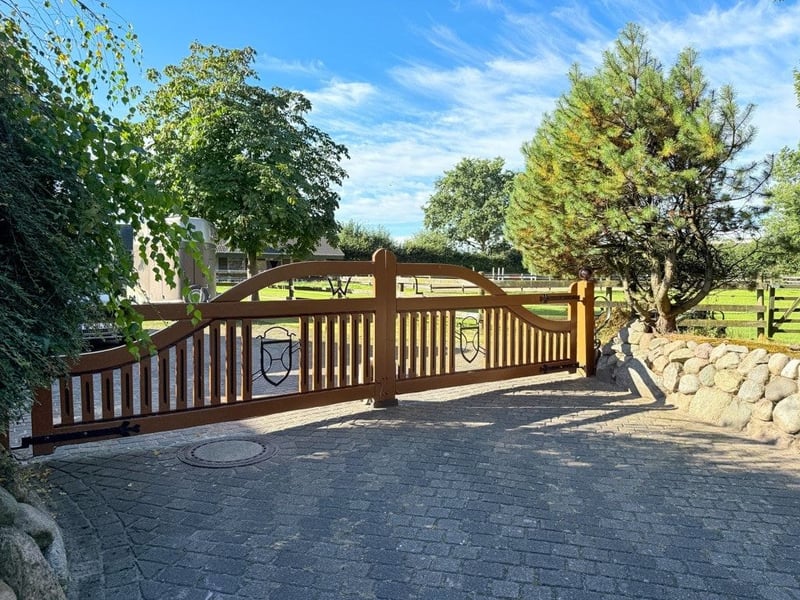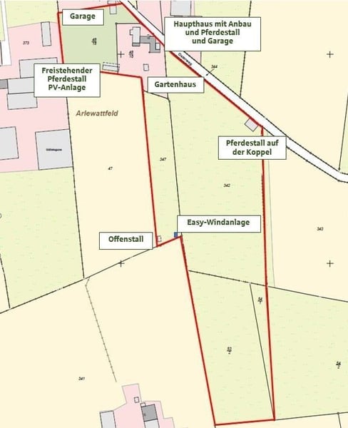 Arlewatt, mitten im Herzen der Pferdehochburg Nordfriesland Gepflegtes landschaftstypisches Reetdachanwesen auf einem ca. 3,38 ha großen Grundstück (arrondiert) mit Easy-Windanlage und PV-Anlage in unmittelbarer Nähe zur Kreisstadt Husum und dem UNESCO-Weltnaturerbe Wattenmeer/Nordsee Ein Paradies für Pferdeliebhaber: Insgesamt 3 Pferdeställe mit 11 Boxen, ein Reitplatz, ein Weideunterstand und ausreichend Grünlandflächen, machen dieses großzügige Anwesen, welches sich gemäss B-Plan in einem „Sondergebiet Reitsport“ befindet, zu einem wahren Paradies für Pferdeliebhaber. In mittelbarer Nähe zur Nordsee und damit dem UNESCO Weltnaturerbe Wattenmeer sowie der Kreisstadt Husum liegt dieses Reetdachanwesen auf einem ca. 3,38 ha großen, arrondierten Areal und damit mitten in Nordfriesland. Ein Paradies für Pferdeliebhaber: Insgesamt 3 Pferdeställe, 11 Boxen, ein Reitplatz und ein Weideunterstand auf dem eigenen Grundstück machen dieses Reetdachanwesen, welches sich lt. Flächennutzungsplan in einem „Sondergebiet Reitsport“ befindet, zu einem wahren Paradies für Pferdeliebhaber. Das reetgedeckte Domizil besticht durch sein charmantes landschaftstypisches Ambiente. Die Nebengebäude und die gärtnerisch angelegten Außenanlagen machen dieses Gebäudeensemble zu einem wahren Juwel. Das über 100 Jahre alte und ständig sanierte und modernisierte Reetdachanwesen verfügt über eine Wohnfläche von ca. 165 m² und eine Nutzfäche von ca. 28 m². Die Nebengebäude haben eine Nutzfläche von insgesamt ca. 357 m². Das Grundstück umfasst ca. 33.782 m². Aufteilung: Haupthaus mit Reetdacheindeckung (ca. 165 m² Wohnfläche und ca. 28 m² Nutzfläche): Erdgeschoss: Großzügiges Wohn-/Esszimmer mit Kachelofen(außer Betrieb) sowie Terrasse mit Markise, ein weiteres Zimmer, Küche mit Einbauküche, Speisekammer, Dusch-/Wannenbad, Hauswirtschaftsraum, Flure Dachgeschoss: Schlafzimmer mit angrenzendem Ankleidezimmer, Duschbad, Flur, Abstellräume Garage mit elektrischem Tor Pferdestall am Haupthaus (ca. 115 m² Nutzfläche) Pferdestall mit 2 Boxen für Großpferde, 2 Boxen für Kleinpferde und Freifläche vor den Boxen), Wintergarten, Sattelkammer, Heizungsraum, Raum für Öltanks Wirtschaftsgebäude Freistehender Pferdestall (ca. 50 m² Nutzfläche) Freistehender Pferdestall in Stahlkonstruktion und Holzbauweise und Satteldach mit 4 Pferdeboxen sowie einer Box als Lager-/ und Anschlussraum.Die Pferdetränken sind beheizbar. Separater Pferdestall auf dem Weideland mit eigener Zufahrt (ca. 110 m² Nutzfläche) Pferdestall als Stahl-/Holzkonstruktion mit Satteldach auf der Koppel mit 3 Pferdeboxen und einer Freifläche vor den Boxen. Offenstall (Nutzfläche ca. 15 m²) Auf der Weide befindet sich ein Offenstall. Massives Gartenhaus (ca. 22 m² Nutzfläche) Massives Gartenhaus mit Satteldach und Eingangstür mit Lichtausschnitt Garage in Holzbauweise (Nutzfläche ca. 45 m²) Das Objekt wurde fortlaufend renoviert und modernisiert. Ein Reitplatz und das dazugehörige Weideland runden dieses Paradies für Reiter ab. Auf dem Grundstück befindet sich eine EASY-Windanlage und eine PV-Anlage. Öl-Zentralheizung mit dem Baujahr 1989 Bedarfsausweis mit Endenergie 373,0 kWh/(m²) Klasse H Übergabe nach Vereinbarung Kaufpreis: 695.000,-- € Gepflegter Zustand: Dieses historische Reetdachanwesen mit Anbau wurde fortlaufend renoviert und modernisiert. Nähe zur Nordsee: In nur wenigen Kilometern sind Sie in der Kreisstadt Husum sowie am Weltnaturerbe Wattenmeer/ Nordsee. Garagen und PKW-Abstellplätze: Auf dem Grundstück befindet sich – neben der Hauptgarage - eine Garage in Holzbauweise (ca. 45 m² ). Es stehen weitere offene Stellplätze für Fahrzeuge zur Verfügung. Windkraftanlage Eine Easy-Windanlage befindet sich auf dem Grundstück. PV-Anlage Eigener Brunnen Ein eigener Brunnen ist auf dem Grundstück vorhanden. Eigene Kläranlage private Kleinkläranlage mit gemeinschaftlichem Klärteich. Funktionale Grundrisse: Das Anwesen ist sehr großzügig geschnitten und bietet insgesamt ca. 165 m² Wohnfläche und ca. 28 m² Nutzfläche im Haupthaus. Wirtschaftsgebäude für den Pferdesport: Siehe Seite 5 Wintergarten Das Anwesen verfügt über einen Wintergarten, der an den Stallteil des Haupthauses gebaut wurde. Pferdeboxen: Verteilt auf insgesamt 3 Pferdeställe verfügt das Anwesen über 11 Pferdeboxen Reitplatz: Kurze Wege garantiert: Unweit des Haupthauses befindet sich in unmittelbarer Nähe zu einem der Ställe ein Reitplatz. (grüner Sand, drainiert). 2 Beregnungsanlagen für den Reitplatz. Friesenwall: Als landschaftstypisches Detail verfügt das Anwesen über einen Friesenwall. Reetdach Das Dach des Haupthauses mit dem angrenzenden Pferdestall ist mit Reet eingedeckt. Massives Gartenhaus Ein massives Gartenhaus für Ihre Gartengeräte und als Werkstatt ist vom Haupthaus schnell zu erreichen. Heizung und Kaminofen: Das Haupthaus wird durch eine Öl-Zentralheizung aus dem Jahr ca. 1989 beheizt. Diese befindet sich im angrenzenden Pferdestall. Zusätzlich befindet sich im Wohn/-Esszimmer ein Kachelofen (außer Betrieb)