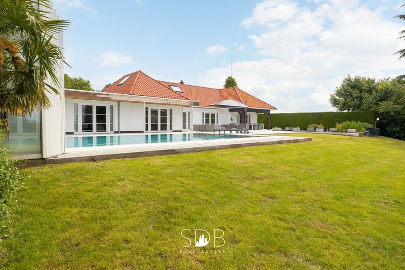 Located in the province of Flemish Brabant, in Affligem, this elegant villa with horse stables and pasture land sits on 1.3 hectares. The charming and stylishly decorated villa is accessible via the entrance hall, which features a guest toilet and leads into the spacious living area where the dining room and living room form a harmonious whole. A highlight is the modern, sleek kitchen in high-gloss white, equipped with all necessary appliances and a concealed pass-through door. This chic kitchen with a minimalist design and high functionality is characterized by clean lines, glossy surfaces, and a handleless design. Adjacent to the kitchen is a versatile living space, currently used as a showroom, which can be freely adapted to your needs. Think of a living area dedicated to relaxation and luxury, wellness, fitness, or other purposes. The office space provides an ideal home office environment. Refined luxury with attention to detail plays a prominent role in the interior of this home. Smart home features make everyday activities easier, including home automation, security cameras, alarm system, air conditioning, and a heat pump—just some of the many advantages of this property. Large windows flood the living spaces with natural light. On the ground floor, there is also a master bedroom with an en-suite bathroom, a spacious dressing room, and a bathroom. The stunning, stylish bathroom is equipped with a double vanity, a bathtub, an infrared walk-in shower, and a toilet—a perfect combination of contemporary comfort and elegant design. The first floor offers two full bedrooms, each with its own bathroom. These bathrooms are fitted with a vanity, shower, and toilet. Additionally, this level features an extra living area that can be freely divided according to your wishes—potentially additional bedrooms or extra living space. Many possibilities are available. The basement includes multiple garages for several vehicles, along with an electric charging station—allowing you to charge overnight and hit the road the next day with a full battery. Next to the garages is a storage room, also serving as a laundry area, with the necessary connections. If you ascend a staircase from this space, you reach an attic offering ample storage space for your belongings. There is also a cellar for additional storage. Outside, adjoining the terrace, is a beautiful outdoor living area with a swimming pool and stunning views of the surrounding pastureland. The magic of outdoor living is fully realized here. The pool with a cover allows for relaxing swims all year round, regardless of the weather. The outdoor sauna elevates your home wellness experience to the next level. There is also a wooden stable building, blending naturally into the environment with its warm, rustic appearance. The five spacious boxes are equipped with outdoor access and overlook the adjoining paddock. The paddock and pasture provide horses with their daily exercise area. The entire setup is enclosed with wooden fencing. As a lover of life and animals, this is truly a place to call home—peace, privacy, and a family-friendly atmosphere are the absolute highlights of this beautiful property. If you wish to expand further, that is possible! There is an option to purchase an adjacent building plot of 2,336 m². Would you like more information about this stunning property? Please do not hesitate to contact us.