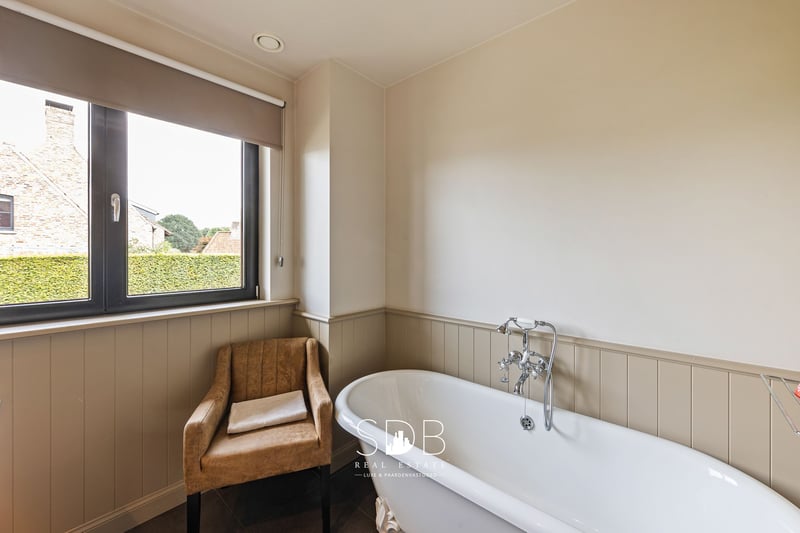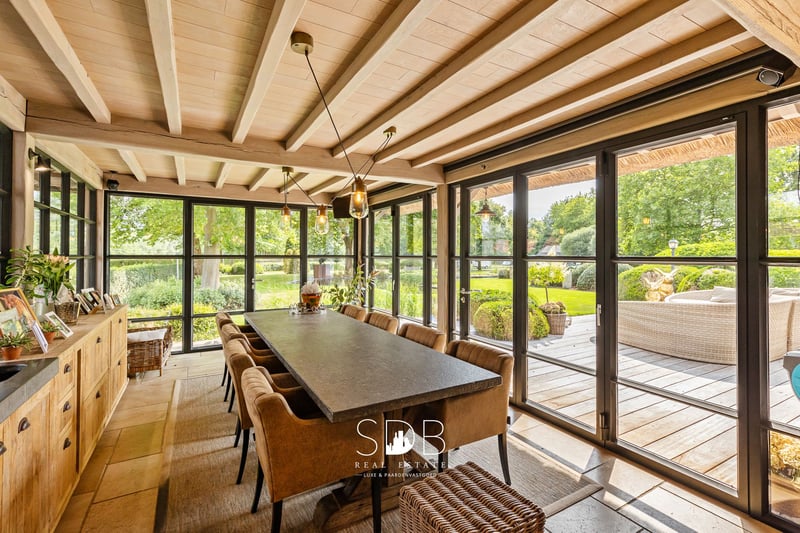 In Lochristi, a municipality in East Flanders, we find this beautiful rural villa with grasslands on 32.558 m². A quiet, green environment with good access to the city. Upon entering the house, we are immediately embraced by the charm of the villa. A spacious entrance hall guides us through the living areas. The beautiful country kitchen is fully equipped and features a stylish kitchen island with seating, perfect for cozy breakfasts or a glass of wine while cooking. Thanks to the use of sustainable materials, integrated appliances, and a harmonious layout, this space is not only very beautiful but also extremely practical. Adjacent to this is the spacious veranda in the same elegant style, which enjoys plenty of natural light thanks to the large windows, which can be fully opened. With an open view of the garden. The living room is divided into a cozy sitting area and a spacious dining area. Together, these form a cozy and inviting living space where atmosphere, comfort, and style blend seamlessly. The oak parquet flooring, built-in oak cupboards, wooden ceiling structures, and elegant fireplace provide timeless charm and a soothing atmosphere. A few steps higher, we find an office space. On the first floor, there are four full bedrooms. There are also two bathrooms, each in their characteristic rustic style. One bathroom is equipped with a double washbasin and a shower. The other bathroom is equipped with a double washbasin and a freestanding bathtub. Given the size of the house, the space between the floors offers additional living space. This living space includes a cozy sitting area and a dining area with an adjoining open country kitchen. From this living space, you have direct access to a spacious roof terrace with a beautiful view of the garden and the meadows behind. The house offers space for parking two cars. Adjacent to the garage is the spacious storage room, also known as the laundry room. Here you will find utilities for a washing machine and dryer. Adjacent to this is the basement, which can be used for storage and practical purposes. The landscaped garden, beautiful plants, sun terrace, and elegant pond are the ideal setting for relaxation and outdoor living in style! This property has parking spaces in front of the house but is also accessible via a side driveway that takes you to the rear. This driveway leads to the grasslands at the rear of the property. Various grasslands are divided into different plots, all enclosed by wooden fencing. Adjacent to an open stable building of no less than 173m². A footpath runs around the grasslands and the stable building, leading back to the villa in a loop. This beautiful villa exudes tranquility, refinement, and quality! Soft colors, rustic accents, and high-quality finishes.... With a unique view of the surrounding greenery and adjacent grasslands. An ideal domain for a horse lover or anyone looking for space for hobbies and outdoor living. Are you interested in this unique property? Please do not hesitate to contact us - www.sdb.realestate