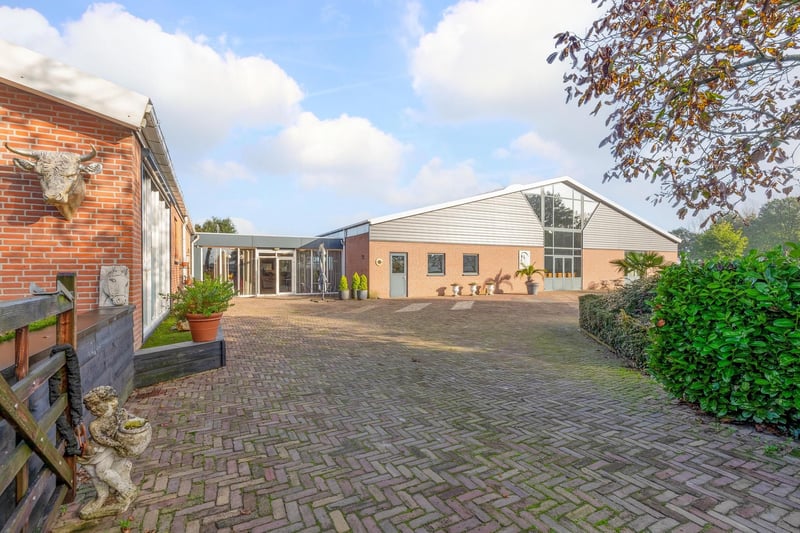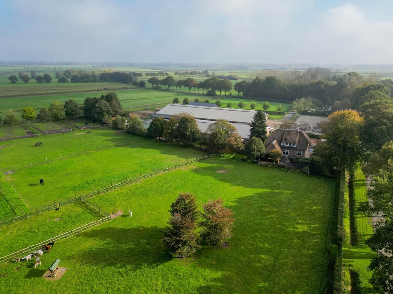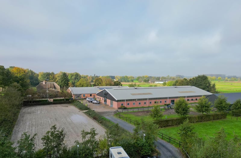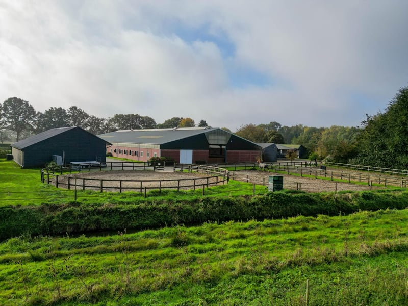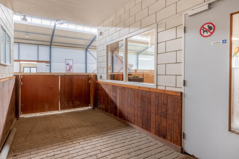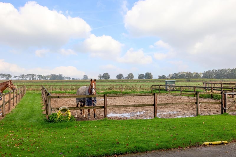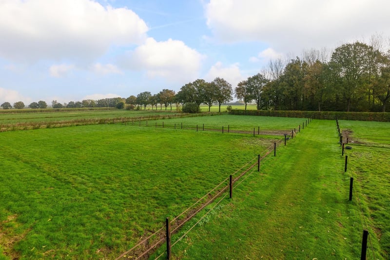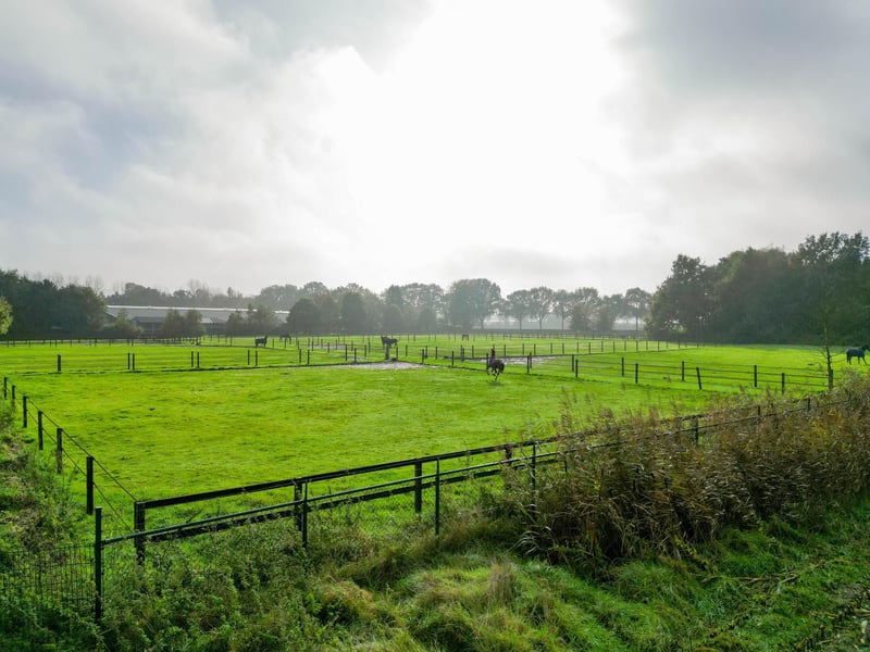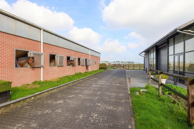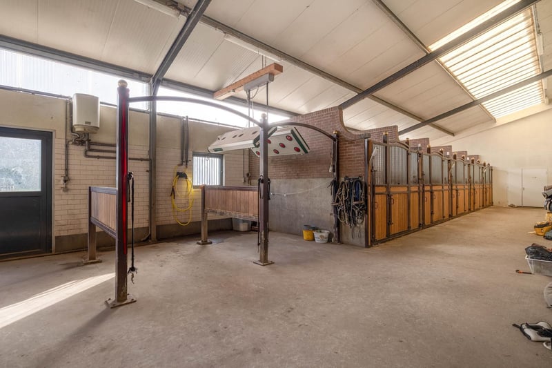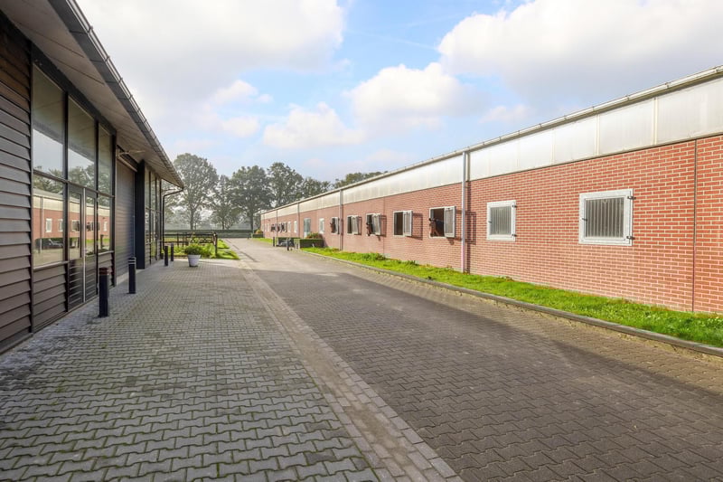 Complete equestrian accommodation including a detached house, flat, office area, a riding hall with indoor arena and a total of 31 horse boxes, an outdoor arena, covered treadmill, lunging circle, several paddocks, pasture, a storage/field barn and a detached shed. All this is situated on a spacious plot of over 4 hectares and offers plenty of opportunities for the professional horse lover! HOUSE The detached house includes an attractive living room, living kitchen, utility room and a cellar on the ground floor. The 1st floor has 3 generous bedrooms and a spacious bathroom. An attic space is located on the 2nd floor. The surrounding garden is beautifully landscaped and equipped with lawn, planting, trees and several terraces. Ground floor: The entrance hall features PVC flooring in herringbone pattern, partly brickwork/partly stucco walls and a stucco ceiling. The hall provides access to the living room, meter cupboard and via a fixed staircase there is access to the 1st floor. The hall has a PVC floor in herringbone pattern, partly masonry/ partly stucco walls and a stucco ceiling. The hall provides access to the living room, meter cupboard and via a fixed staircase there is access to the 1st floor. The spacious living kitchen is also equipped with the same PVC floor in herringbone pattern. The walls and ceiling have been plastered. The kitchen layout is in a U-shape with a storage island. The kitchen is further equipped with a dishwasher, combination microwave oven, sink, 5-burner gas hob and fridge. From the kitchen, there is access to the cellar. The cellar is fully tiled and equipped with a cuckoo and a window. There are fixed shelves and a wooden staircase. A hatch provides access to the space under the house. The practical utility room is partly tiled and the floor is covered with a tiled floor which has underfloor heating. Practical sliding cupboards provide storage space. This is where the central heating combi boiler, the underfloor heating unit and the connections for the washing equipment are located. From the utility room, there is access to the toilet room and the yard. The toilet room is fully tiled and further equipped with a hand basin and a floating toilet. 1st floor: The generous landing provides access to 3 spacious bedrooms and a bathroom. Bedroom I is carpeted, with sprayed walls and a sprayed ceiling. From this room, a fixed staircase provides access to the storage attic. The room further features a practical built-in wardrobe. Bedroom II is also finished with carpeted floors, sprayed walls and a sprayed ceiling. Fixed sliding wardrobes provide storage space. The spacious bathroom is fully tiled and further equipped with a bathtub, walk-in shower, washbasin with cabinet and a design radiator. The toilet room is fully tiled and equipped with a floating toilet. The very spacious master bedroom was formerly divided into two bedrooms. This is relatively easy to realise again. The room is finished with carpeting, spachtelputz walls and a sprayed ceiling. A practical closet and sliding wardrobes provide storage space. Many windows provide plenty of natural light. Garden: The garden surrounding the house is beautifully landscaped and well maintained. The garden is laid out with borders with perennials, trees, lawn and several terraces. At the front is a terrace, at the rear the terrace has a very beautiful and attractive canopy. This canopy is made of oak and has a glass wall. The roof is covered with reeds. The terrace offers beautiful views of the meadows. In short, a lovely place to be! A little further on is an aviary and another covered terrace. From here, too, there is a beautiful view of the meadows. EQUESTRIAN ACCOMMODATION The equestrian accommodation includes a detached riding hall with an indoor arena (approx. 20mtr. x 60mtr), a horse stable with a reception area and a total of 31 horse boxes divided over 2 stable areas, an office area, workshop and an adjoining flat. The stable section on the left side is equipped with 16 horse boxes. These stalls have partly hardwood / partly powder-coated and partly galvanised front walls. The partitions are of masonry and partly occupied. The doors the front walls are hinged. 2 stalls are equipped with partly plastic / partly galvanised front and partition walls and sliding doors. There is also 1 pony stall. There are 2 washing areas and a solarium. The washing areas are equipped with hot and cold water supply. From the stable area, there is access to a hall where the 2 saddle rooms are located. From this hall, there is also access to the reception area and indoor arena. The spacious reception area is finished with a tiled floor, part masonry/part stucco walls and a system ceiling. There is a toilet block consisting of a toilet room, disabled toilet and a portal with 2 washbasins. There is also a complete kitchen. The kitchen is equipped with an oven, combination microwave oven, dishwasher, built-in coffee maker, sink and hob. n the reception area, the meter cupboard is located. This is where the central heating combi boiler is located. The room also has an alarm system. From the reception area, there are lovely views of the indoor arena. French doors provide access to the yard. The adjoining indoor arena (approx. 20mtr. x 60mtr.) is equipped with an ebb and flow floor and a hardwood arena surround (Horsmans). A skylight in the ridge and windows in the end wall provide natural light and ventilation. Furthermore, the arena is equipped with a mirror wall. A rolling door at the rear wall provides access to the yard. From the indoor arena, there is access to the stable area on the right. This stable area has 13 horse stalls. These stalls (approx. 4mtr. x 3mtr.) are fitted with partly powder-coated / partly galvanised and hinged doors. The stalls are also equipped with an exterior hatch. There is also a tack room, washing area and solarium here. From this stable area, there is access to a canteen. This canteen is finished with l
