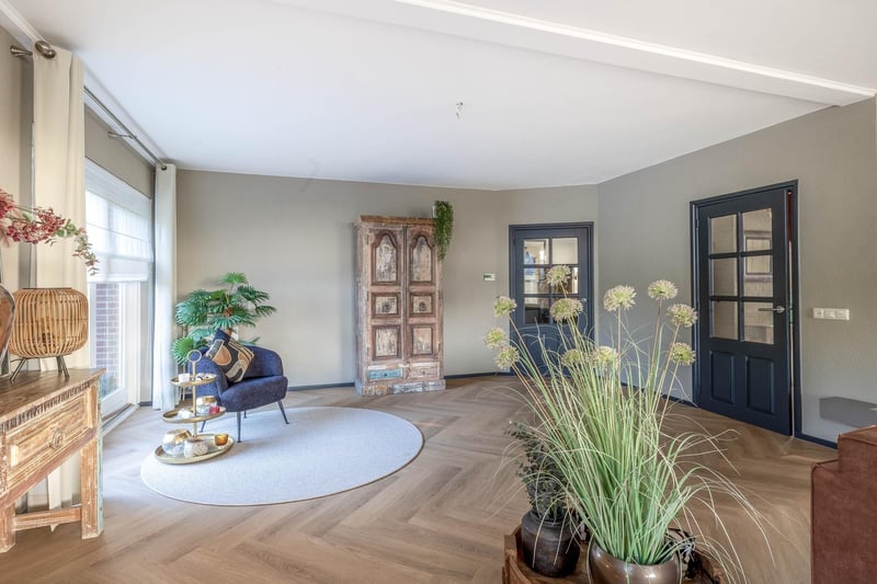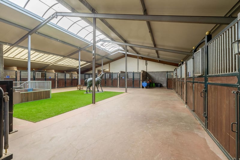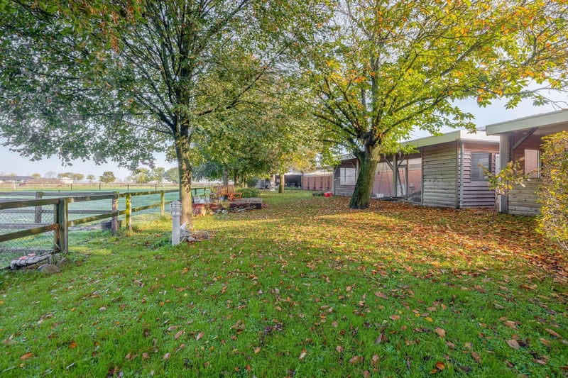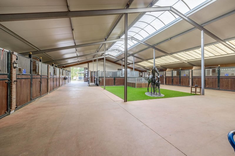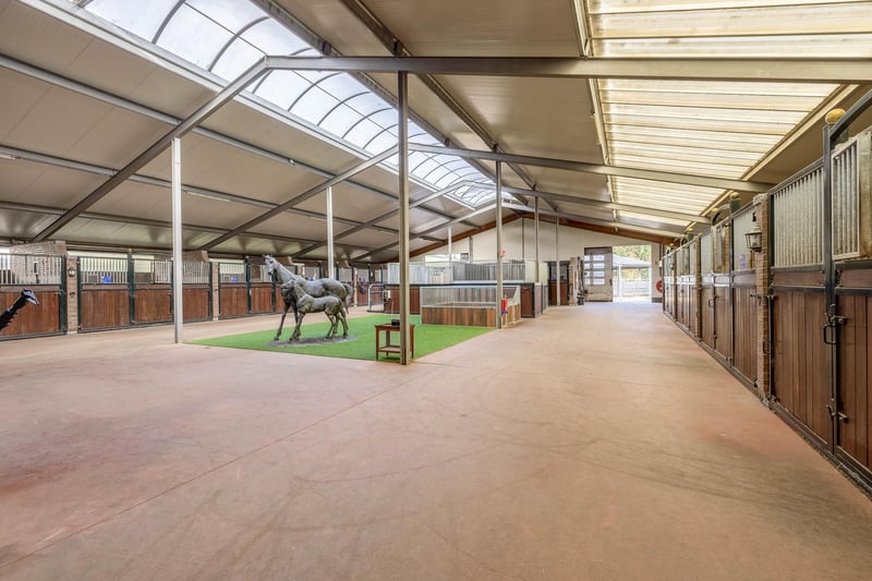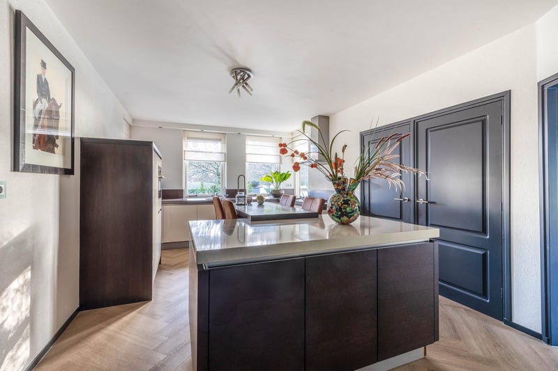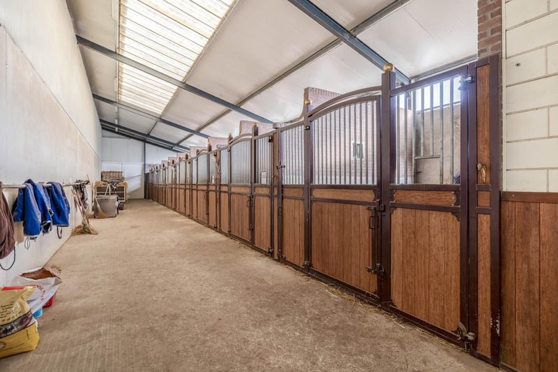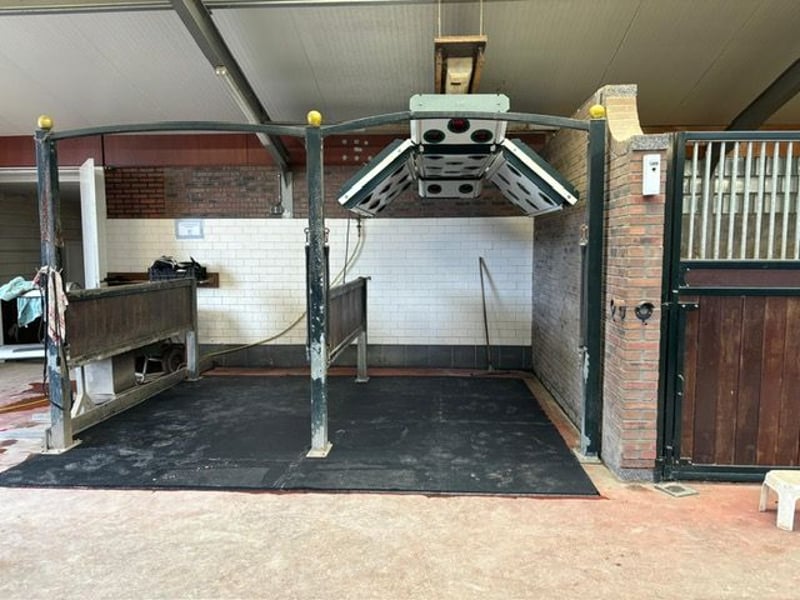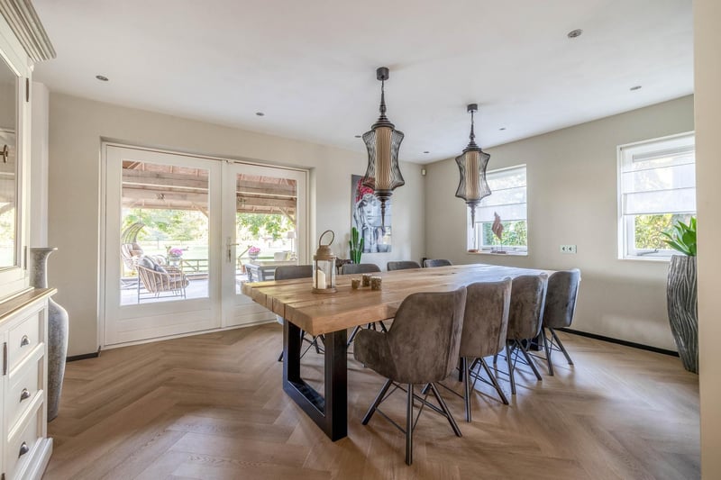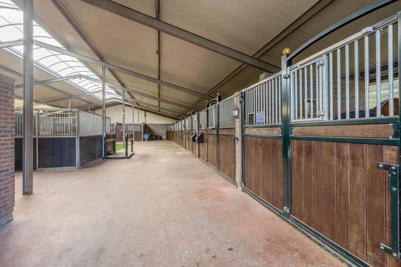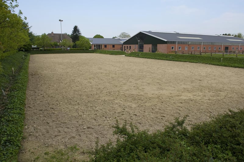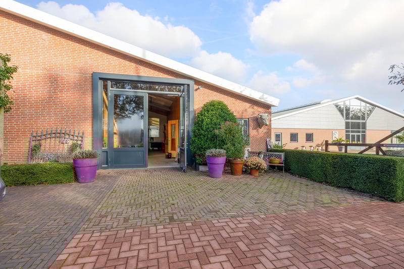 Complete equestrian accommodation including a detached house, flat, office area, a riding hall with indoor arena and a total of 31 horse boxes, an outdoor arena, covered treadmill, lunging circle, several paddocks, pasture, a storage/field barn and a detached shed. All this is situated on a spacious plot of over 4 hectares and offers plenty of opportunities for the professional horse lover! HOUSE The detached house includes an attractive living room, living kitchen, utility room and a cellar on the ground floor. The 1st floor has 3 generous bedrooms and a spacious bathroom. An attic space is located on the 2nd floor. The surrounding garden is beautifully landscaped and equipped with lawn, planting, trees and several terraces. Ground floor: The entrance hall features PVC flooring in herringbone pattern, partly brickwork/partly stucco walls and a stucco ceiling. The hall provides access to the living room, meter cupboard and via a fixed staircase there is access to the 1st floor. The hall has a PVC floor in herringbone pattern, partly masonry/ partly stucco walls and a stucco ceiling. The hall provides access to the living room, meter cupboard and via a fixed staircase there is access to the 1st floor. The spacious living kitchen is also equipped with the same PVC floor in herringbone pattern. The walls and ceiling have been plastered. The kitchen layout is in a U-shape with a storage island. The kitchen is further equipped with a dishwasher, combination microwave oven, sink, 5-burner gas hob and fridge. From the kitchen, there is access to the cellar. The cellar is fully tiled and equipped with a cuckoo and a window. There are fixed shelves and a wooden staircase. A hatch provides access to the space under the house. The practical utility room is partly tiled and the floor is covered with a tiled floor which has underfloor heating. Practical sliding cupboards provide storage space. This is where the central heating combi boiler, the underfloor heating unit and the connections for the washing equipment are located. From the utility room, there is access to the toilet room and the yard. The toilet room is fully tiled and further equipped with a hand basin and a floating toilet. 1st floor: The generous landing provides access to 3 spacious bedrooms and a bathroom. Bedroom I is carpeted, with sprayed walls and a sprayed ceiling. From this room, a fixed staircase provides access to the storage attic. The room further features a practical built-in wardrobe. Bedroom II is also finished with carpeted floors, sprayed walls and a sprayed ceiling. Fixed sliding wardrobes provide storage space. The spacious bathroom is fully tiled and further equipped with a bathtub, walk-in shower, washbasin with cabinet and a design radiator. The toilet room is fully tiled and equipped with a floating toilet. The very spacious master bedroom was formerly divided into two bedrooms. This is relatively easy to realise again. The room is finished with carpeting, spachtelputz walls and a sprayed ceiling. A practical closet and sliding wardrobes provide storage space. Many windows provide plenty of natural light. Garden: The garden surrounding the house is beautifully landscaped and well maintained. The garden is laid out with borders with perennials, trees, lawn and several terraces. At the front is a terrace, at the rear the terrace has a very beautiful and attractive canopy. This canopy is made of oak and has a glass wall. The roof is covered with reeds. The terrace offers beautiful views of the meadows. In short, a lovely place to be! A little further on is an aviary and another covered terrace. From here, too, there is a beautiful view of the meadows. EQUESTRIAN ACCOMMODATION The equestrian accommodation includes a detached riding hall with an indoor arena (approx. 20mtr. x 60mtr), a horse stable with a reception area and a total of 31 horse boxes divided over 2 stable areas, an office area, workshop and an adjoining flat. The stable section on the left side is equipped with 16 horse boxes. These stalls have partly hardwood / partly powder-coated and partly galvanised front walls. The partitions are of masonry and partly occupied. The doors the front walls are hinged. 2 stalls are equipped with partly plastic / partly galvanised front and partition walls and sliding doors. There is also 1 pony stall. There are 2 washing areas and a solarium. The washing areas are equipped with hot and cold water supply. From the stable area, there is access to a hall where the 2 saddle rooms are located. From this hall, there is also access to the reception area and indoor arena. The spacious reception area is finished with a tiled floor, part masonry/part stucco walls and a system ceiling. There is a toilet block consisting of a toilet room, disabled toilet and a portal with 2 washbasins. There is also a complete kitchen. The kitchen is equipped with an oven, combination microwave oven, dishwasher, built-in coffee maker, sink and hob. n the reception area, the meter cupboard is located. This is where the central heating combi boiler is located. The room also has an alarm system. From the reception area, there are lovely views of the indoor arena. French doors provide access to the yard. The adjoining indoor arena (approx. 20mtr. x 60mtr.) is equipped with an ebb and flow floor and a hardwood arena surround (Horsmans). A skylight in the ridge and windows in the end wall provide natural light and ventilation. Furthermore, the arena is equipped with a mirror wall. A rolling door at the rear wall provides access to the yard. From the indoor arena, there is access to the stable area on the right. This stable area has 13 horse stalls. These stalls (approx. 4mtr. x 3mtr.) are fitted with partly powder-coated / partly galvanised and hinged doors. The stalls are also equipped with an exterior hatch. There is also a tack room, washing area and solarium here. From this stable area, there is access to a canteen. This canteen is finished with l
