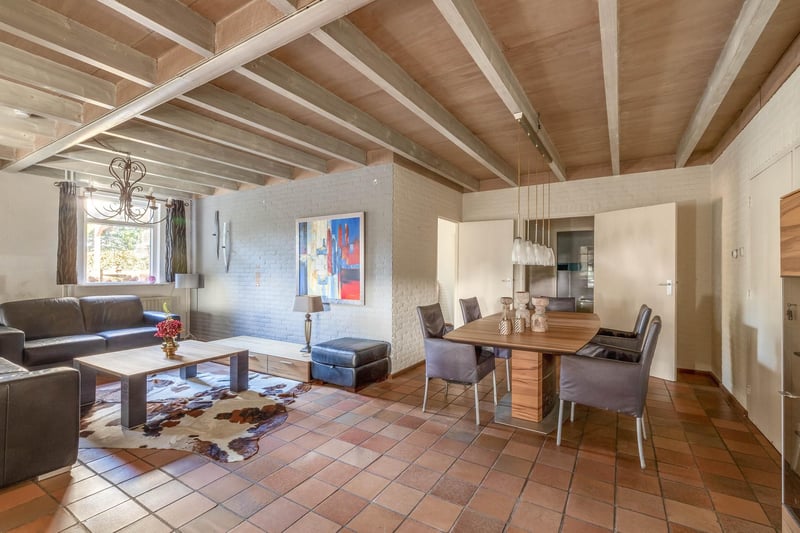 Sistemazione equestre completa che comprende una casa indipendente, un appartamento, una zona ufficio, un maneggio con arena coperta e un totale di 31 box per cavalli, un'arena all'aperto, un tapis roulant coperto, un circolo di affondo, diversi paddock, un pascolo, un deposito/fienile e un capannone indipendente. Tutto questo si trova su un ampio terreno di oltre 4 ettari e offre numerose opportunità per gli amanti dei cavalli professionisti! CASA La casa indipendente comprende un bel soggiorno, una cucina abitabile, un ripostiglio e una cantina al piano terra. Al 1° piano si trovano 3 generose camere da letto e un ampio bagno. Al 2° piano si trova una mansarda. Il giardino circostante è ben curato e dotato di prato, piante, alberi e diverse terrazze. Piano terra: L'ingresso presenta pavimenti in PVC a spina di pesce, pareti in parte in mattoni e in parte in stucco e soffitto in stucco. Dall'ingresso si accede al soggiorno, all'armadio dei contatori e, tramite una scala fissa, al 1° piano. L'ingresso ha un pavimento in PVC a spina di pesce, pareti in parte in muratura/parzialmente in stucco e soffitto in stucco. Dal corridoio si accede al soggiorno, all'armadio dei contatori e, tramite una scala fissa, al 1° piano. Anche la spaziosa cucina abitabile è dotata dello stesso pavimento in PVC a spina di pesce. Le pareti e il soffitto sono stati intonacati. La cucina è disposta a U con un'isola di stoccaggio. La cucina è inoltre dotata di lavastoviglie, forno a microonde combinato, lavello, piano cottura a gas a 5 fuochi e frigorifero. Dalla cucina si accede alla cantina. La cantina è completamente piastrellata e dotata di un cucù e di una finestra. Sono presenti scaffali fissi e una scala in legno. Una botola consente di accedere allo spazio sotto la casa. Il pratico ripostiglio è parzialmente piastrellato e il pavimento è rivestito di piastrelle con riscaldamento a pavimento. Pratici armadietti scorrevoli offrono spazio di archiviazione. Qui si trovano la caldaia combinata per il riscaldamento centrale, l'unità di riscaldamento a pavimento e i collegamenti per gli impianti di lavaggio. Dal ripostiglio si accede al bagno e al cortile. Il bagno è completamente piastrellato e dotato di un lavabo e di un wc galleggiante. 1° piano: Il generoso pianerottolo dà accesso a 3 spaziose camere da letto e a un bagno. La camera da letto I è rivestita di moquette, con pareti e soffitto spruzzati. Da questa stanza, una scala fissa permette di accedere al sottotetto. La camera dispone inoltre di un pratico armadio a muro. Anche la camera da letto II è rifinita con pavimenti in moquette, pareti spruzzate e soffitto spruzzato. Gli armadi scorrevoli fissi offrono spazio di archiviazione. Lo spazioso bagno è completamente piastrellato e dotato di vasca, cabina doccia, lavabo con mobile e radiatore di design. Il bagno è completamente piastrellato e dotato di una toilette galleggiante. La camera da letto principale, molto spaziosa, era in passato divisa in due camere da letto. È relativamente facile realizzarla di nuovo. La stanza è rifinita con moquette, pareti in spachtelputz e soffitto spruzzato. Un pratico armadio e armadi scorrevoli offrono spazio di archiviazione. Le numerose finestre garantiscono un'abbondante illuminazione naturale. Giardino: Il giardino che circonda la casa è ben curato e paesaggistico. Il giardino è composto da bordure con piante perenni, alberi, prato e diverse terrazze. Sul davanti si trova una terrazza, mentre sul retro la terrazza ha una tettoia molto bella e attraente. Questa tettoia è in legno di quercia e ha una parete di vetro. Il tetto è ricoperto di canne. La terrazza offre una bella vista sui prati. In breve, un luogo incantevole! Poco più avanti si trovano una voliera e un'altra terrazza coperta. Anche da qui si gode di una bella vista sui prati. ALLOGGIO EQUESTRE La struttura equestre comprende un maneggio indipendente con un'arena coperta (circa 20mtr. x 60mtr.), una scuderia con un'area di accoglienza e un totale di 31 box per cavalli suddivisi in 2 aree di scuderia, un'area ufficio, un'officina e un appartamento adiacente. La sezione della scuderia sul lato sinistro è dotata di 16 box per cavalli. Questi box hanno pareti frontali in parte in legno duro, in parte verniciate a polvere e in parte zincate. Le pareti divisorie sono in muratura e in parte occupate. Le porte delle pareti anteriori sono incernierate. 2 stalli sono dotati di pareti frontali e divisorie in parte in plastica / in parte zincate e di porte scorrevoli. C'è anche 1 stallo per pony. Sono presenti 2 aree di lavaggio e un solarium. Le aree di lavaggio sono dotate di acqua calda e fredda. Dall'area della scuderia si accede a un corridoio dove si trovano i 2 locali per le selle. Da questa sala si accede anche all'area di ricevimento e all'arena interna. L'ampia area di ricevimento è rifinita con un pavimento piastrellato, pareti in parte in muratura e in parte in stucco e un soffitto a sistema. È presente un blocco di servizi igienici composto da un bagno, un bagno per disabili e un portale con 2 lavabi. È presente anche una cucina completa. La cucina è dotata di forno, forno a microonde combinato, lavastoviglie, macchina per il caffè da incasso, lavello e piano cottura. Qui si trova la caldaia combinata del riscaldamento centrale. La stanza dispone anche di un sistema di allarme. Dalla reception si gode di una bella vista sull'arena interna. Le porte-finestre danno accesso al cortile. L'arena interna adiacente (circa 20 m. x 60 m.) è dotata di un pavimento a flusso e riflusso e di una cornice in legno duro (Horsmans). Un lucernario nel colmo e finestre nella parete di fondo forniscono luce naturale e ventilazione. Inoltre, l'arena è dotata di una parete a specchio. Una porta avvolgibile sulla parete posteriore consente l'accesso al cortile. Dall'arena interna si accede all'area delle scuderie sulla destra. Quest'area dispone di 13 box per cavalli. Questi box (circa 4 me