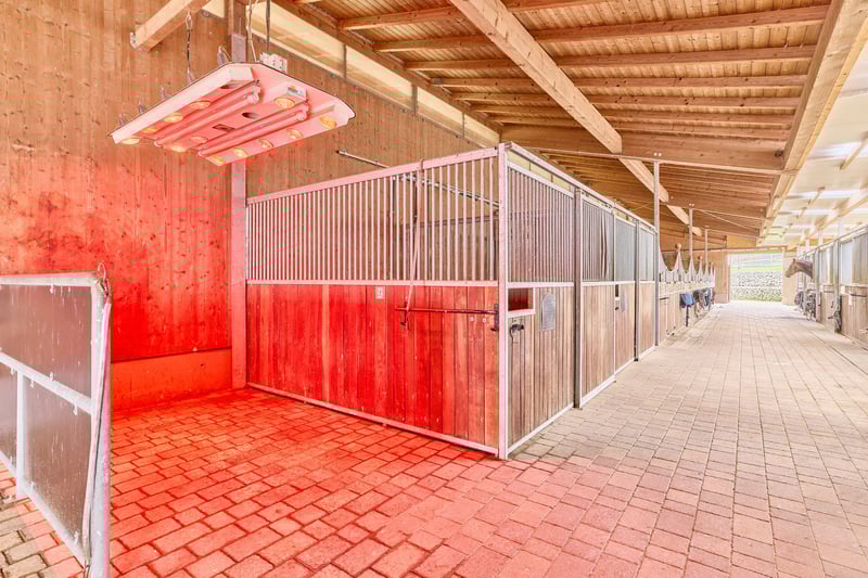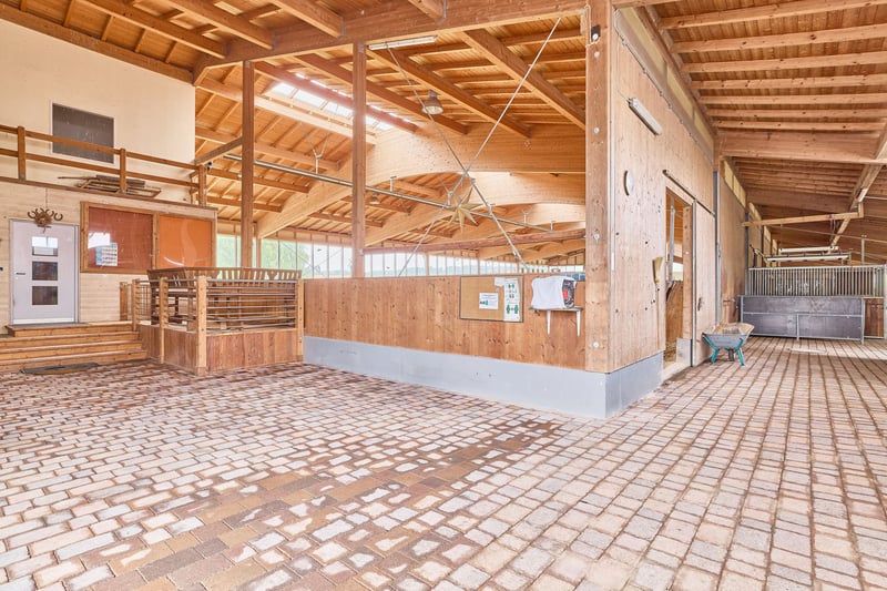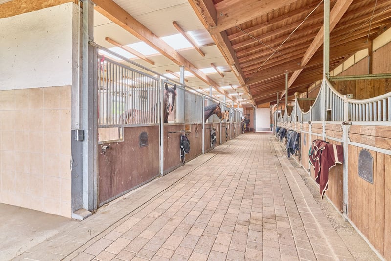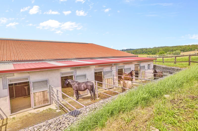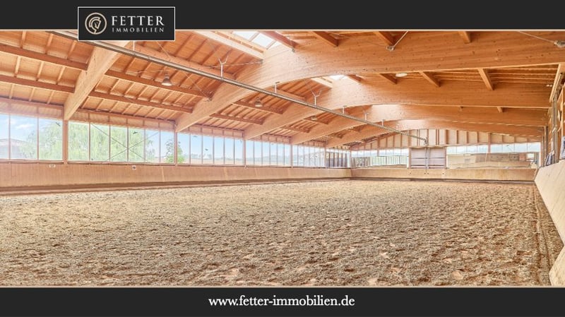 Please complete the contact form below before calling us by phone. Thank you for your understanding! Property Description: A dressage facility that will make your heart race – professional infrastructure meets historic charm and an exceptionally well-maintained ambiance. We are pleased to present this high-quality equestrian estate in Bavaria, which caters to both demanding riders and horse enthusiasts with a taste for historic elegance. The property features a spacious indoor riding arena measuring 20 × 40 meters, equipped with a modern sprinkler system, integrated storage areas, seating, and even a staff apartment. The training facilities are complemented by a covered, mud-free lunging ring for six horses – ideal for thoughtful and gentle exercise management. Directly on the estate are sand paddocks and grass pastures where horses can enjoy free movement. There is also an open stable with its own sand paddock. Additionally, approximately 1.8 hectares of leased pastureland are available, directly adjoining the property – a significant advantage for daily management. The equestrian estate offers space for approximately 21 horses, distributed across two stable blocks. The private area with seven boxes and a dedicated tack room can be perfectly separated from the operational section with fourteen additional boxes. A large part of the facility consists of spacious paddock boxes, combining species-appropriate housing with comfort. The total area of the courtyard is 9,796 m²; further areas are leased long-term. The estate’s special charm is enhanced by the historic main house, which has been extensively renovated and could be divided into two residential units if desired. A partially cellared vaulted basement and the impressive cross-vaulted banquet hall, connecting the residential house with the stable area, create a unique ambiance and offer versatile usage options. This dressage facility combines professional standards with historic flair, providing ideal conditions for ambitious riders, trainers, businesses, or horse lovers. We invite you to arrange a viewing and experience the quality of this exceptional estate firsthand. Features: Main House: - Built: 1863/1865 - Living and utility space: approx. 485.40 m² (10 rooms) - Dividable into 2 residential units (kitchen and bathroom on each floor) - Partially basemented (vaulted cellar including wine cellar) - Well pump in the cellar, biogas treatment plant available - Soapstone stove from approx. 2016 in the living room - Genuine hardwood parquet floors - Windows: double-glazed - Ceiling height: 2.70 meters The house’s cross-vaulted banquet hall, already extensively renovated, features high-quality stone flooring. It is equipped with a Bullerjan stove for heating (ideal as a courtyard café or similar). Currently used as storage, it offers the possibility to access the stable building on foot from here. Indoor Riding Arena: - Built: 2006 - Riding surface: 20 x 40 meters - Floor: sand/fleece mixture from Söder - Sprinkler system using well water (Rega GmbH filter) - Fully glazed, with mirrors - Storage space / guest apartment on the upper floor of the main building or usable as a groom’s room with shower and WC - Ground floor: riding lounge or staff apartment (kitchen, bathroom, bedroom, living area) Stabling: - Private stable with 7 boxes (3 indoor boxes with windows & 4 paddock boxes), measuring 3.90 x 3 meters, including wash area with solarium and private tack room (lockable) - Additional stable: 14 boxes (8 indoor, 6 paddock), measuring 3.40 x 3.60 meters, paddock 5.50 x 3.40 meters, also with tack room, wash area, and solarium Barn Building: - Built: 1859 (listed building), already renovated - Storage for hay & straw (approx. 170 bales, local supplier) - Machinery shelter - Feed area with oats silo Lunging Ring: - Built: 2016/2017 - Diameter: 20 meters, for 6 horses - Covered hoof path - Floor: Ridcon mats with wood chip base Additional: - Approved manure storage area - Parking spaces and paved access road - Trailer parking Location: Market Bibart is a municipality in the Neustadt an der Aisch-Bad Windsheim district in Middle Franconia, situated in the Steigerwald between Nuremberg and Würzburg along the Bibart river. The town is part of the Greater Nuremberg transport network and has a train station on the Fürth–Würzburg line, served hourly by regional express RE 10 (Würzburg–Nuremberg). The surrounding area is accessible via several bus lines. The federal road B8 runs through Market Bibart, with B286 connecting to B8 at Enzlar. The municipality belongs to the administrative community of Scheinfeld and has approximately 2,500 inhabitants. In Market Bibart, there are elementary schools, kindergartens, a middle school, and a music school. All essential daily amenities (shopping, medical services, pharmacies, kindergartens, primary and secondary schools, banks, restaurants) are sufficiently available. The area offers a high quality of life away from city noise, with many recreational opportunities. Excellent transport links allow easy access to Würzburg and Nuremberg. The community comprises six districts, including Enzlar, where the estate is located. The property is situated outside the residential area with access to the federal road, making shopping quick and straightforward. The rural surroundings are perfect for cycling, walking, and scenic riding adventures with your equine partner. Energy Certificate: Main energy source: heating oil Energy consumption certificate End energy demand: 139.78 kWh/(m²*a) Energy efficiency class: E Built: 1863, heating system from 1998 Additional Information: Unauthorized access to the equestrian estate outside of scheduled viewings with the responsible broker Fetter Immobilien is strictly prohibited by the owners. A commission of 3.57% of the purchase price including VAT applies upon notarization and is payable upon signing the notarized purchase agreement. A detailed exposé in